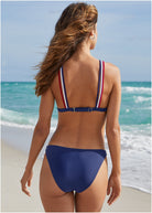Now, it's a party in the USA! Dive into every summer holiday with this star-spangled triangle bikini top made partially from recycled nylon. With its classic red, white and blue color scheme and sparkling star accents, this top is ready for every celebration. Pair it with its matching bikini bottom to complete your Americana aesthetic.