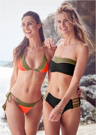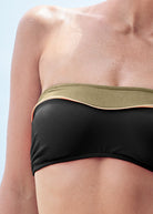 Our strappy bandeau style has a cool color block variant! A thin metallic trim refines this ultramodern style.