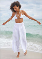 These breezy wide-leg pants are exactly what you want to be wearing après swim. With an easy pull-on elastic waist and flattering high-rise fit, they're equally comfy and statement-making. Toss them on over your suit and go from beach to street in seconds. * Sizes: XS (2), S (4-6), M (8-10), L (12-14), XL (16) * Plus sizes: 1X (18-20), 2X (22-24), 3X (26-28) * 30" inseam * Elastic waist * Wide legs * Rayon. Imported
