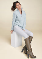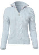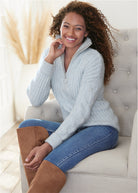For those cold days when all you need is an easy, throw-on-and-go look, this Quarter Zip Sweater has you covered. Snuggly cable knit brings classic styling to this pullover style that zips from the chest all the way up the high collar that can lie open in a V-neck or zip tight into a turtleneck. * Sizes: XS (2), S (4-6), M (8-10), L (12-14), XL (16) * Plus sizes: 1X (18-20), 2X (22-24), 3X (26-28) * Quarter zip with embellished ring detail zipper * Cable knit detail * 23" approx. length; varies by size * Poly/rayon/nylon. Imported