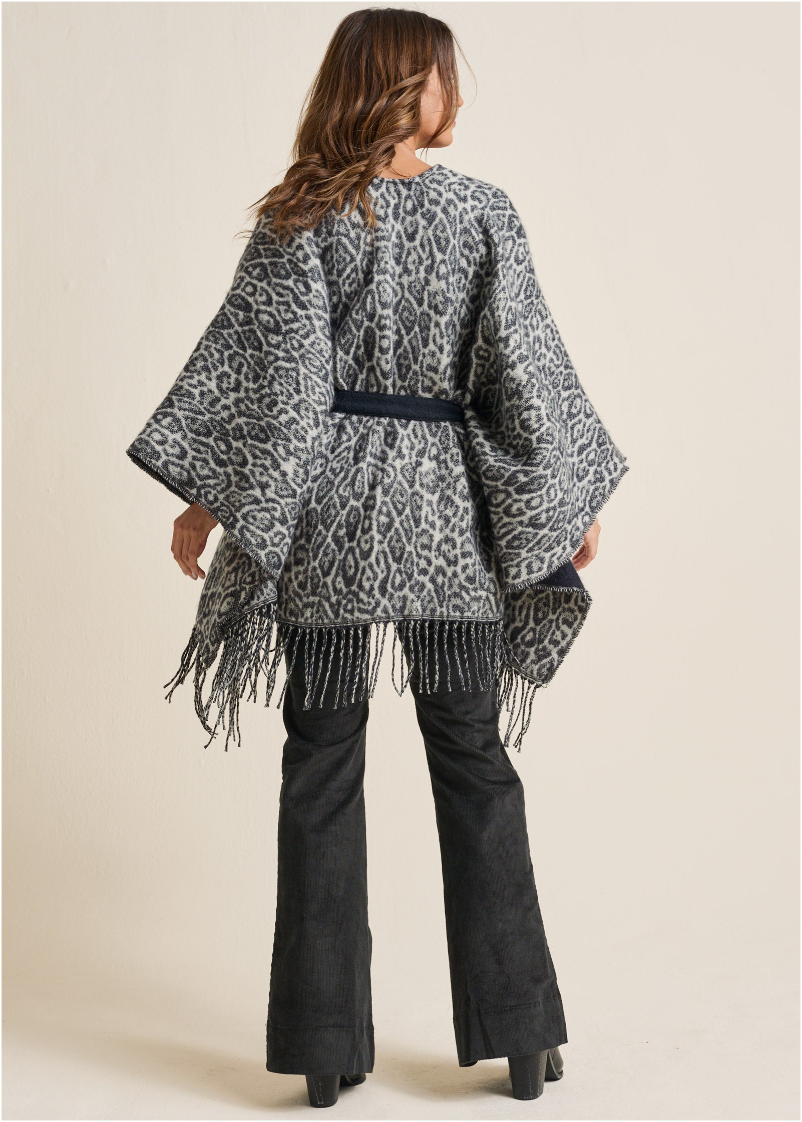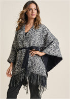 Wrap yourself in this cozy leopard-print cape on cool days. With its bold print and fun fringe trim, it's a total outfit maker. A sash belt ties around the waist, adding definition to the draped silhouette. We like it paired with flares to balance its oversize shape. * OS fits most * 36" approx. length; varies by size * Tie closure * Acrylic. Imported