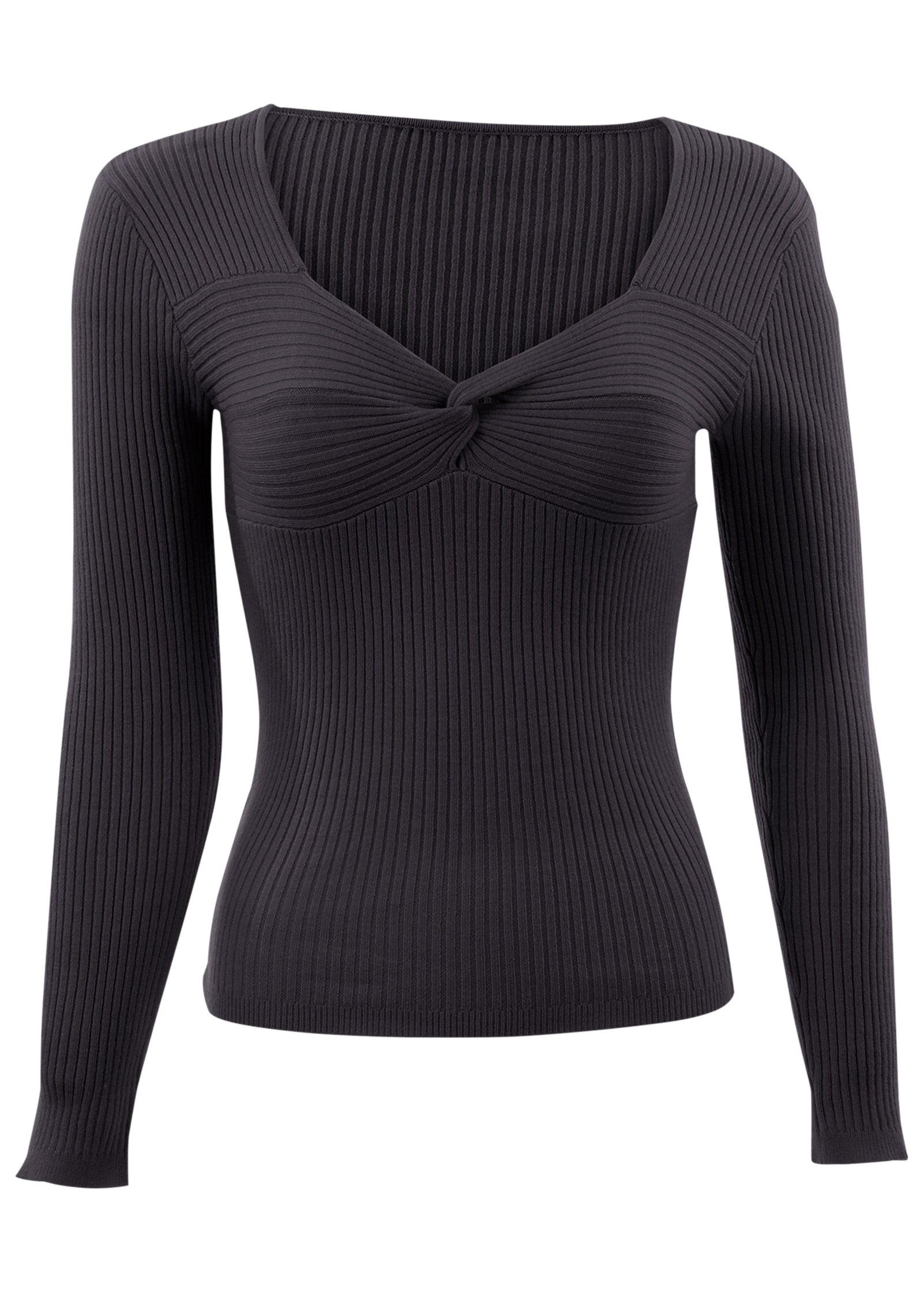 Like a warm embrace on a cold day, this snug and stretchy sweater top hugs you tight for a cozy and comfy fit. Ribbed texture makes this basic anything but, while a twist at the front adds a feminine detail. Dress it up with heels or go casual with sneaks. The best part about this knit is how versatile it is. * Sizes: XS (2), S (4-6), M (8-10), L (12-14), XL (16) * 22.5" from shoulder * Pullover * Fabric has stretch * Viscose/poly/nylon. Imported