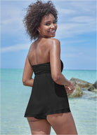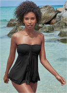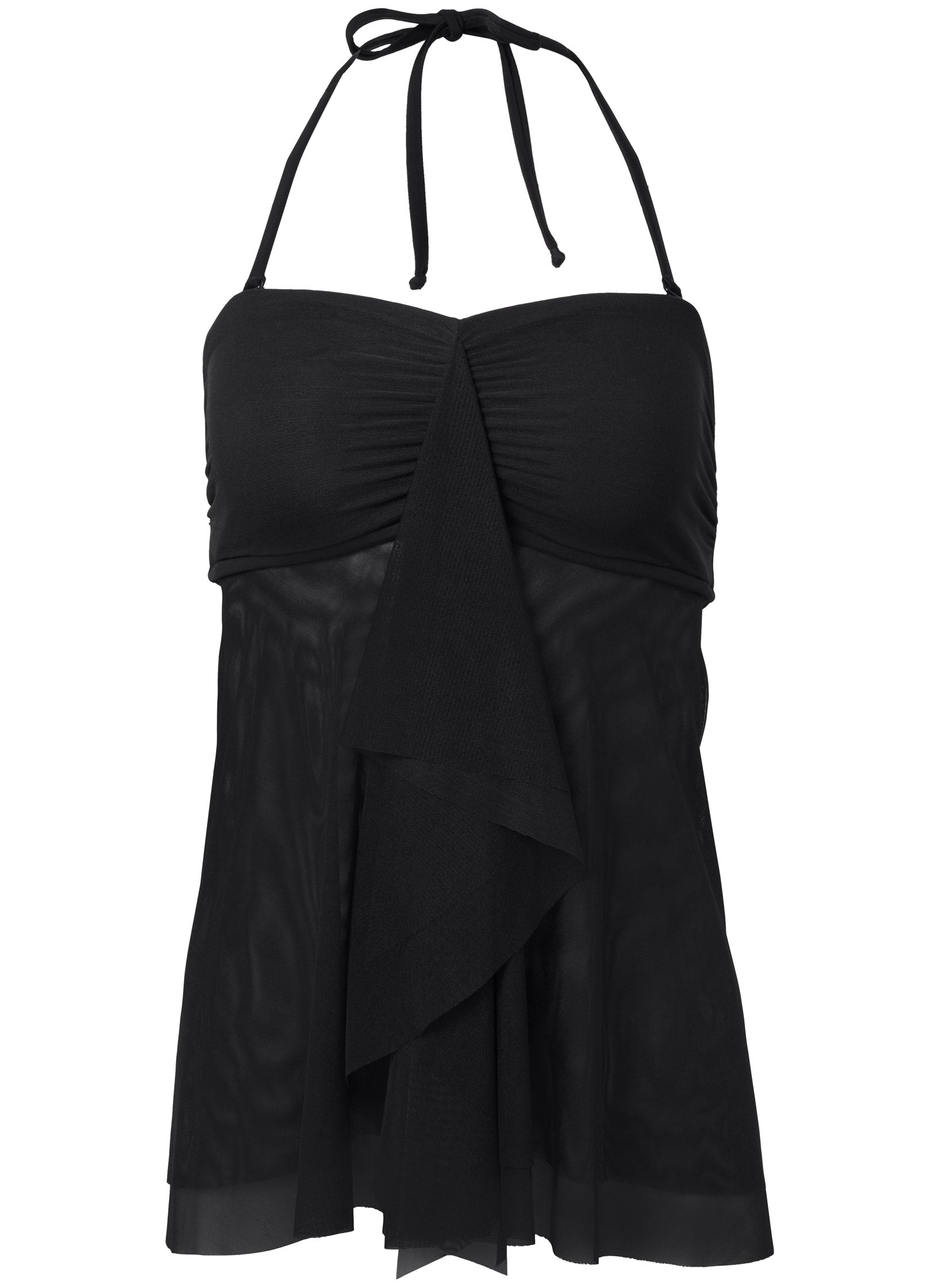 This flirty tankini boasts a sheer, floaty bodice with a draping sash down the front for extra breeziness. Bustline ruching adds fullness to this style that lets you keep the halter strap attached for added support or opt for a strapless look to embrace your sexy side.