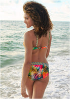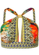 Set yourself apart in this head-turning bikini top. It adjusts with comfortable shoulder straps and features a large center keyhole for added flirt. Jewel-like patterns edge the center and bottom while a decorative gold band cinches the straps, adding a glitzy finish to this tropical essential. * Available in plus sizes * For printed items; placement may vary * Adjustable shoulder straps * Keyhole cutout at center front * Removable padding * Adjustable slider back strap * Domestic or import of nylon/spandex tricot