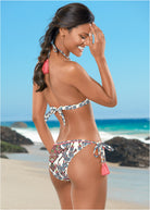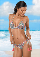 Halter style triangle top features pom poms around the edges of the cups and tassels at the ends of the halter ties. Self tie at the center back lets you customize the fit!