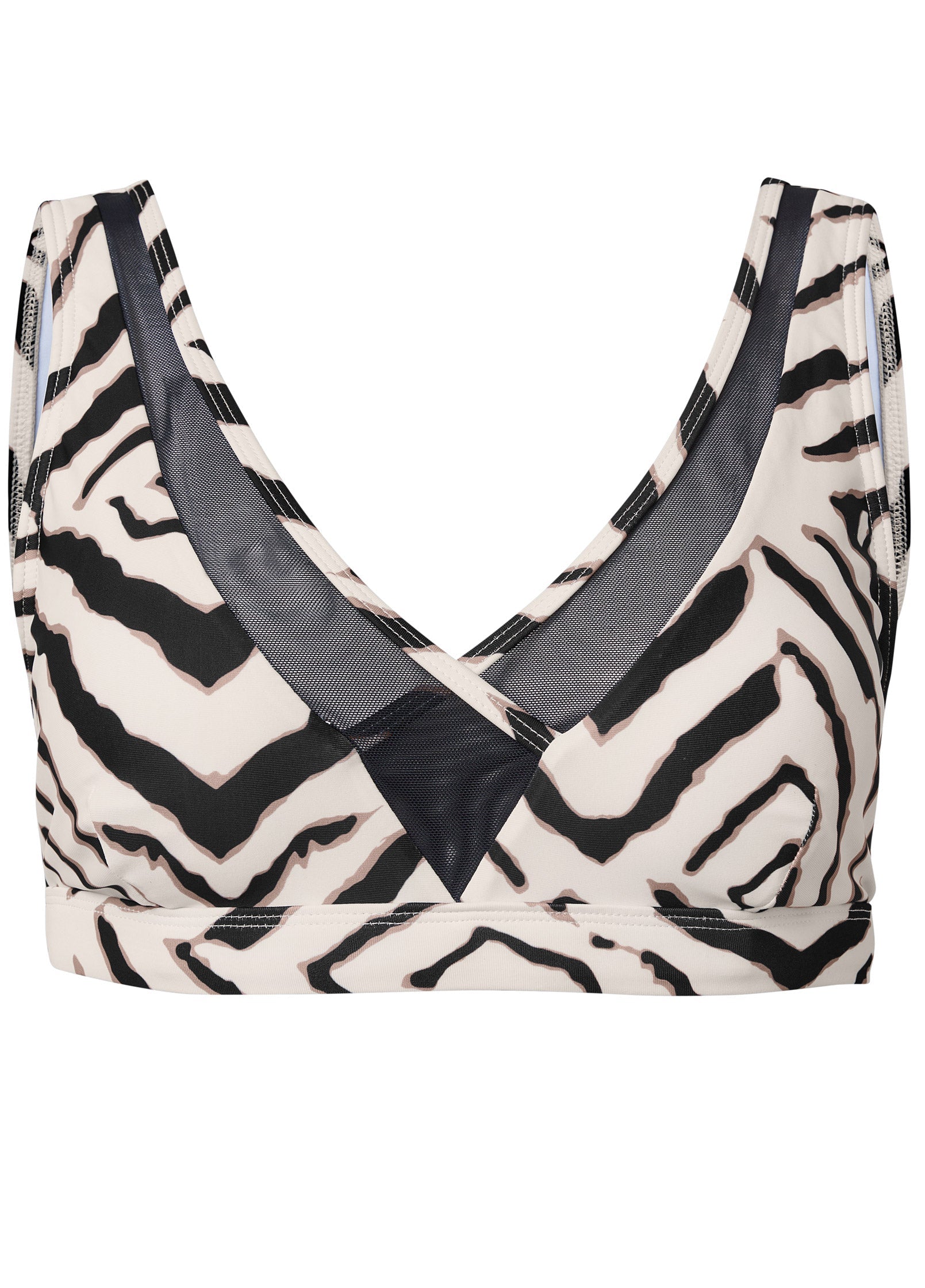 Stay on top of your swim game in this sporty-chic bikini top that strikes the right balance between covered and revealing. Wide shoulder straps add support and sheer mesh trim at the neckline allows a peek of skin to show through. The square open back is an unexpected twist to this trendy bikini.