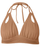 Bring on the heat when you slip into this halter neck bikini top with its V-cut front, peek-a-boo cutouts at the top of both cups and gentle gathers at the base of the cups for flattering fullness. Secure the back and neck ties and get set for a day in the sun!