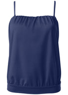 The elastic gathers at the top and banded bottom of this tankini top ensure a secure fit as you enjoy warm weather days. This figure-enhancing top finishes with a soft fabric band that sits at the hips and comes with removable straps for sunning or swimming. * Available in plus size * Shelf bra with removable foam shaping cups * Soft fabric band at bottom * For printed items; placement may vary * Detachable neck strap * Shoulder straps are wider in larger sizes * Tankini hem sits at high hip * Domestic or import of quality nylon/spandex tricot