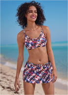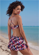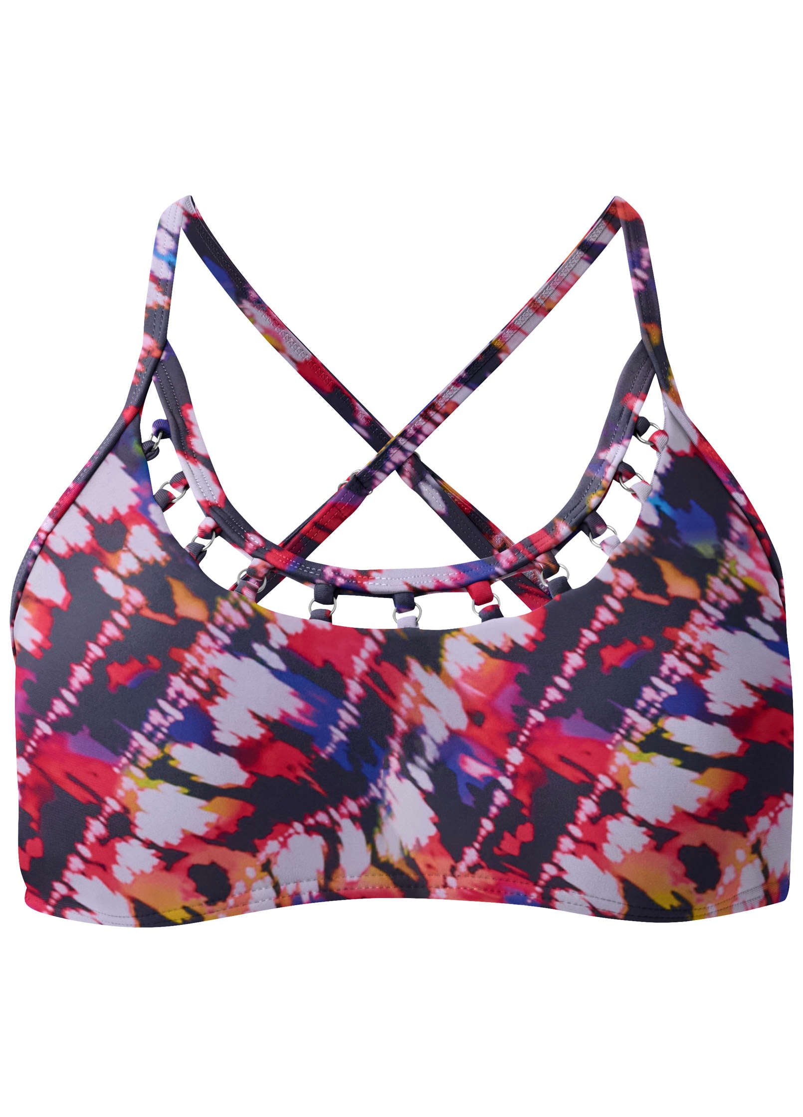 Sporty with a glam twist, this scoop neck bikini top boasts bold open trim with strappy details at the neck, accented by delicate rings that give it elevated appeal. Adjustable shoulder straps crisscross in the back, giving an extra detail that also adds lift.