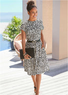 Looking for a dress that’s as easy as it is stylish? This Short Sleeve Printed Dress has you covered! With short sleeves, a flattering scoop neckline, and a playful A-line silhouette, it’s the perfect mix of comfort and chic. Pair it with sneakers for an effortlessly casual look, or dress it up with heels or wedges for work or happy hour—because why settle for basic when you can turn heads? * Sizes: XS (2), S (4-6), M (8-10), L (12-14), XL (16) * Short sleeves: Perfect for warmer days and easy layering. Knee length: Flattering and versatile for any occasion. * Scoop neckline: Feminine and easy to wear. * A-line fit: Flows beautifully for a flattering, relaxed look. * By Lascana for VENUS * Viscose. Imported