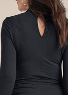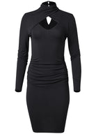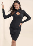 The contoured wrapped mock neck and all over bodycon fit of this long-sleeve midi dress reveal your edgier side. Boasting cutouts at the neckline and back that reveal peeks of skin, this winning dress uses ruching across the hips for extra smoothness. Layer with a jacket or cardigan for a more casual spin. * Sizes: XS (2), S (4-6), M (8-10), L (12-14), XL (16) * Plus sizes: 1X (18-20), 2X (22-24), 3X (26-28) * Wrapped mock neck * Front and back cutout * Ruched waist * Hits above the knee 38" * Fabric has stretch * Ecovero viscose/spandex. Imported