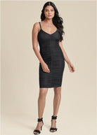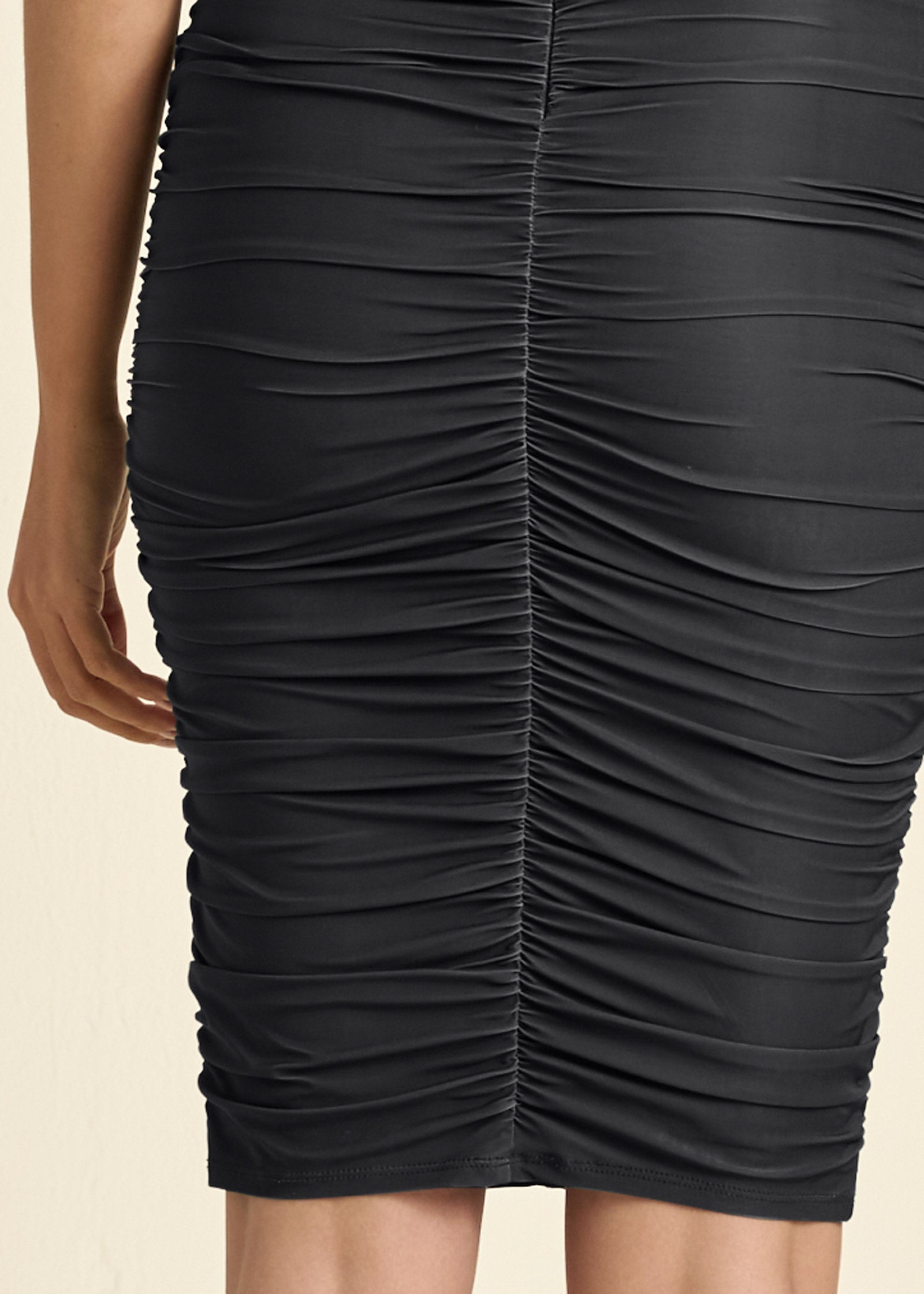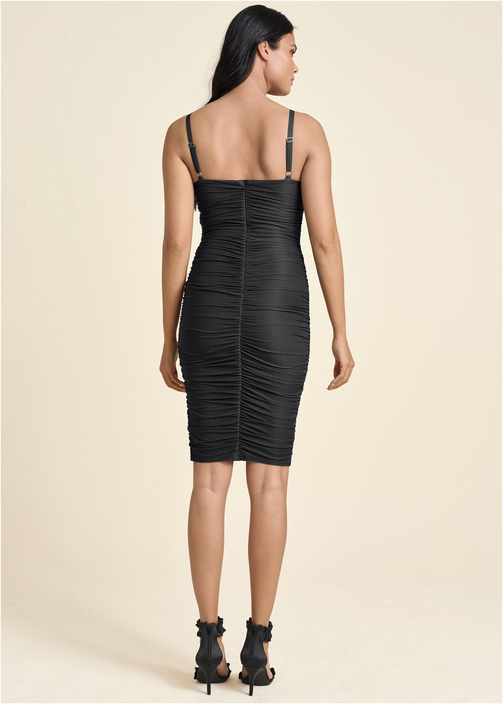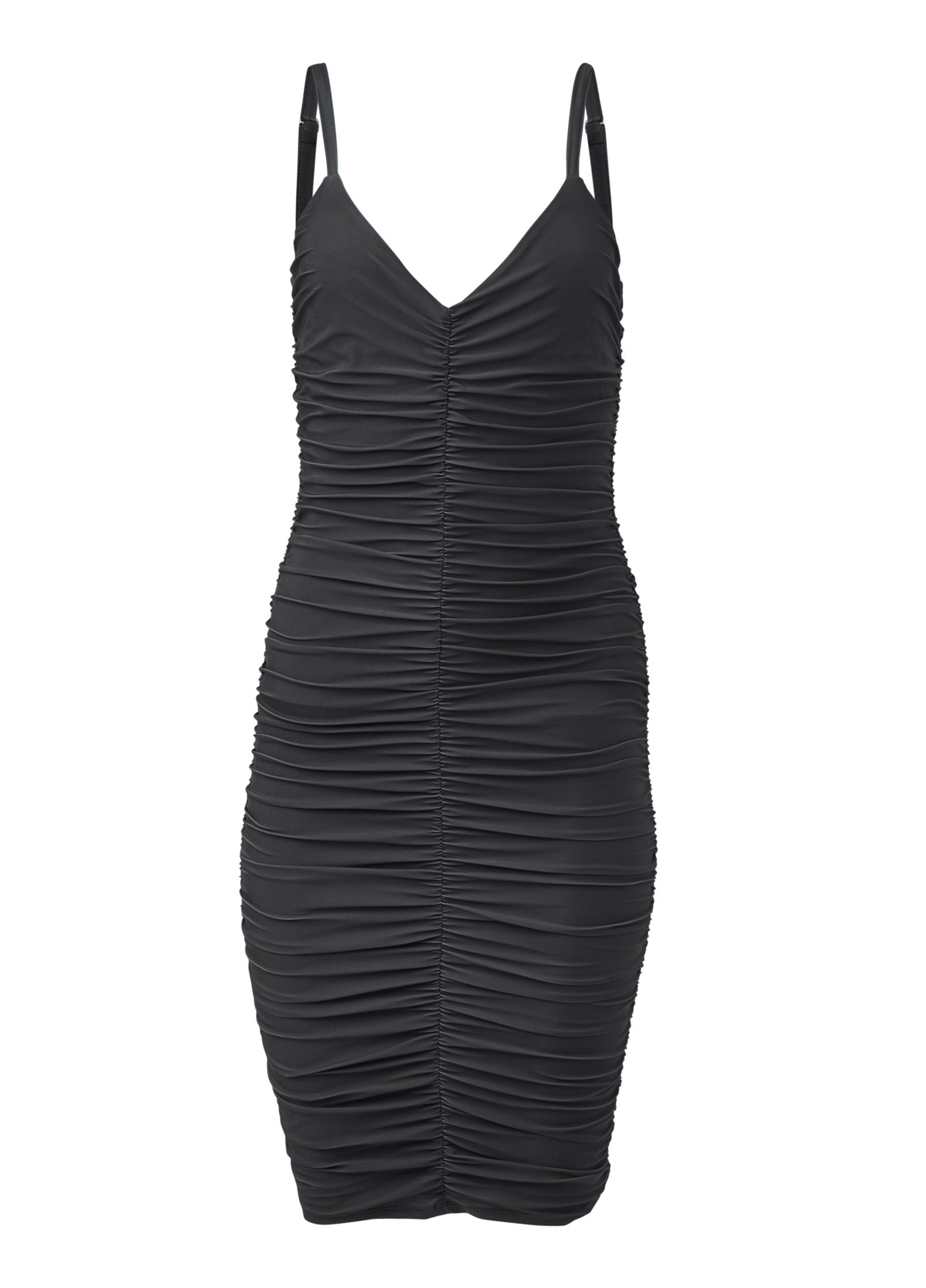 Ruched and ready to party, this mini feels instantly at home in your occasion-wear rotation. Vertical seams at center front and back have a flattering effect that hugs your figure. The subtle dip of the neckline leaves space for a necklace, while adjustable spaghetti straps make it easy to layer.