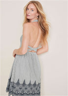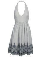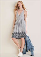 This dress is as unique as you are, from the pinstripes to the embroidered hem. The halter neckline and deep V-neckline draws attention to your upper body, while the elastic waist hits your middle just right. The embroidered patterned trim is a showstopping addition that sets this dress apart. Wear it with sneakers during the day and wedges at night for the ultimate attention-grabbing look. * Halter neckline * Center back zipper * Elastic waist * Embroidered trim * Cotton. Imported