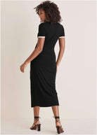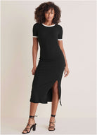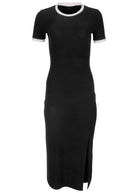 Ready to slay the night? This Ribbed Contrast Midi Dress is your new date night essential. With a crew neckline, short sleeves, and contrast detailing on the neckline and sleeves, it’s a simple yet stylish look with just the right amount of edge. The bodycon fit hugs your curves, while the asymmetrical hemline adds a modern twist. Pair it with your favorite heels, and you’re set for a night that’s all about confidence and style.