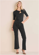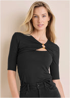 This isn't your average basic. It's packed with serious drama, thanks to a chic off-center neckline and flirty cut-out detail. The soft, stretchy fabric hugs in all the right places, while 3/4 sleeves keep it sleek and versatile. Effortless yet eye-catching, it’s the perfect mix of casual and elevated. * Sizes: XS (2), S (4-6), M (8-10), L (12-14), XL (16) * Plus sizes: 1X (18-20), 2X (22-24), 3X (26-28) * Off-center neckline: Unique circle detail adds a stylish twist. * Flattering scoop neck: A classic shape with a modern update. * Cut-out detail: Just the right amount of edge. * 3/4 sleeves: A polished touch for day-to-night wear. * Soft, stretchy fabric: Comfort meets style. * Versatile styling: Pair with black denim for nights out or denim shorts for a laid-back vibe. * Ecovero Viscose/spandex. Imported