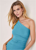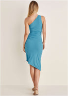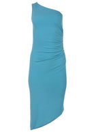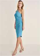 Curve-hugging stretch and ruching give this bodycon dress the perfect fit. From the one-shoulder neckline to the asymmetrical hem that falls just below the knee, it's equal parts sophisticated and statement-making. Done in our lightweight and drapey Does It All Jersey, make it your occasion go-to or slip it on for date night when you want to look (and feel) like a million bucks. * Sizes: XS (2), S (4-6), M (8-10), L (12-14), XL (16) * Plus sizes: 1X (18-20), 2X (22-24), 3X (26-28) * From shoulder: 39" at shortest, 47" at longest missy, 40" at shortest, 48" at longest plus * One-shoulder neckline * Bodycon fit * Asymmetrical hem * Midi length * Does It All Jersey (Polyester/elastane. Imported)