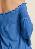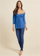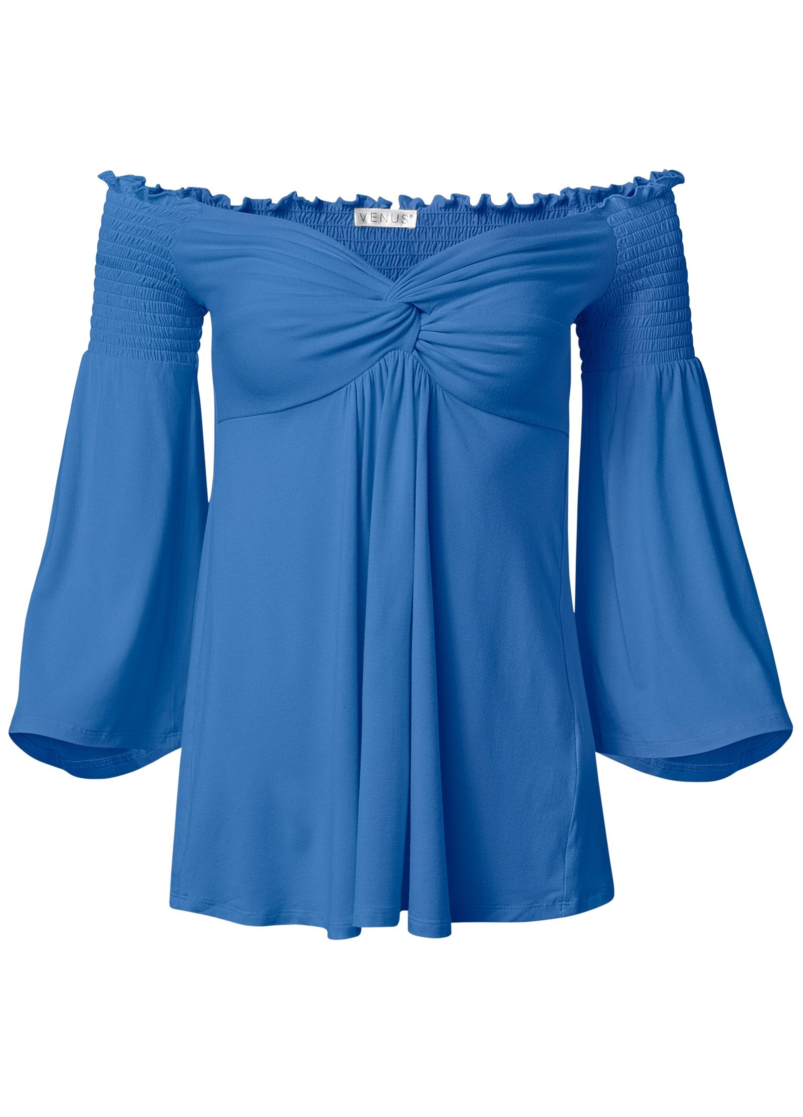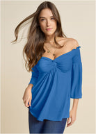 A flirty babydoll silhouette meets a sultry off-the-shoulder neckline in this pretty, twirly top. The knot twist at the bust defines the sweetheart shape that smooths and flatters, while smocking at the back and upper sleeves hug your figure. Flared sleeves match the bodice in an allover feminine shape.