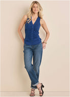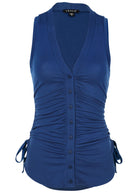 Laidback, meet extra-chic. This button-front tank blends both into an elevated silhouette that's made for warmer days. The V-neckline and sleeveless design give it a light, breezy vibe, while the side ties and ruching add a feminine touch that flatters your shape. With its stretchy fabric, this tank moves with you, making it a must-have for warm weather. Wear it with breezy pants for an elevated daytime look, or pair it with your favorite shorts for a more casual, effortless style. * Sizes: XS (2), S (4-6), M (8-10), L (12-14), XL (16) * V-neckline: A flattering cut that adds a touch of elegance. * Button front closure: Adds a playful detail for a stylish finish. * Side ties & ruching: Flattering and feminine for that perfect fit. * Stretchy fabric: Comfortable for all-day wear. * Versatile styling: Pair with breezy pants for a chic look, or keep it casual with shorts. * Ecovero viscose/spandex. Imported
