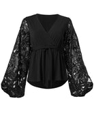Wear your love for sparkle on your sleeves with this surplice V-neck top. Its statement-making long sleeves are set to impress in a dramatic bell shape with sheer lace coverage and shimmering sequins throughout. An underbust self-tie sash keeps the upper part snug while allowing billowy folds below. * Sizes: XS (2), S (4-6), M (8-10), L (12-14), XL (16) * Plus sizes: 1X (18-20), 2X (22-24), 3X (26-28) * Sheer, sequin embellished sleeves * Sash tie at waist * Polyester/spandex. Imported