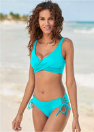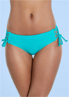 Lattice detailing at hips with adjustable ties for perfectly fitting, moderate rear coverage bikini bottoms.