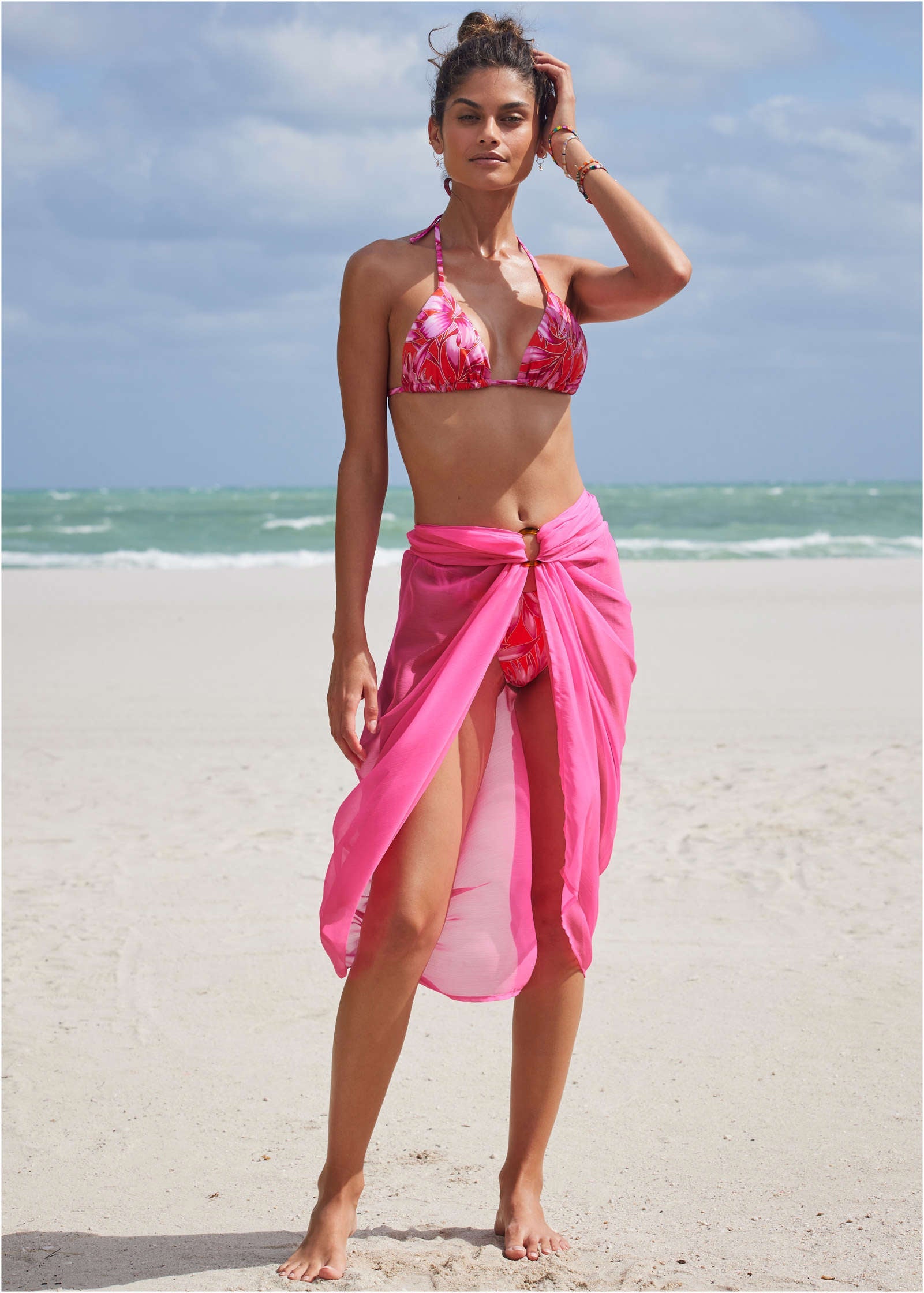 This cover-up is one of those beachy pieces that's just as much about adding to your swim look as it is about covering up. This breezy pareo can be tied and worn five different ways! Style it as a halter dress, a one-shoulder dress, a strapless dress, a midi skirt or a mini skirt. Trust us, you definitely want to pack this one in your suitcase. *O/S (one size fits most sizes 2-16) * For printed items, print placement may vary * Sheer coverage * Poly. Imported