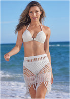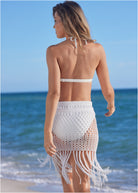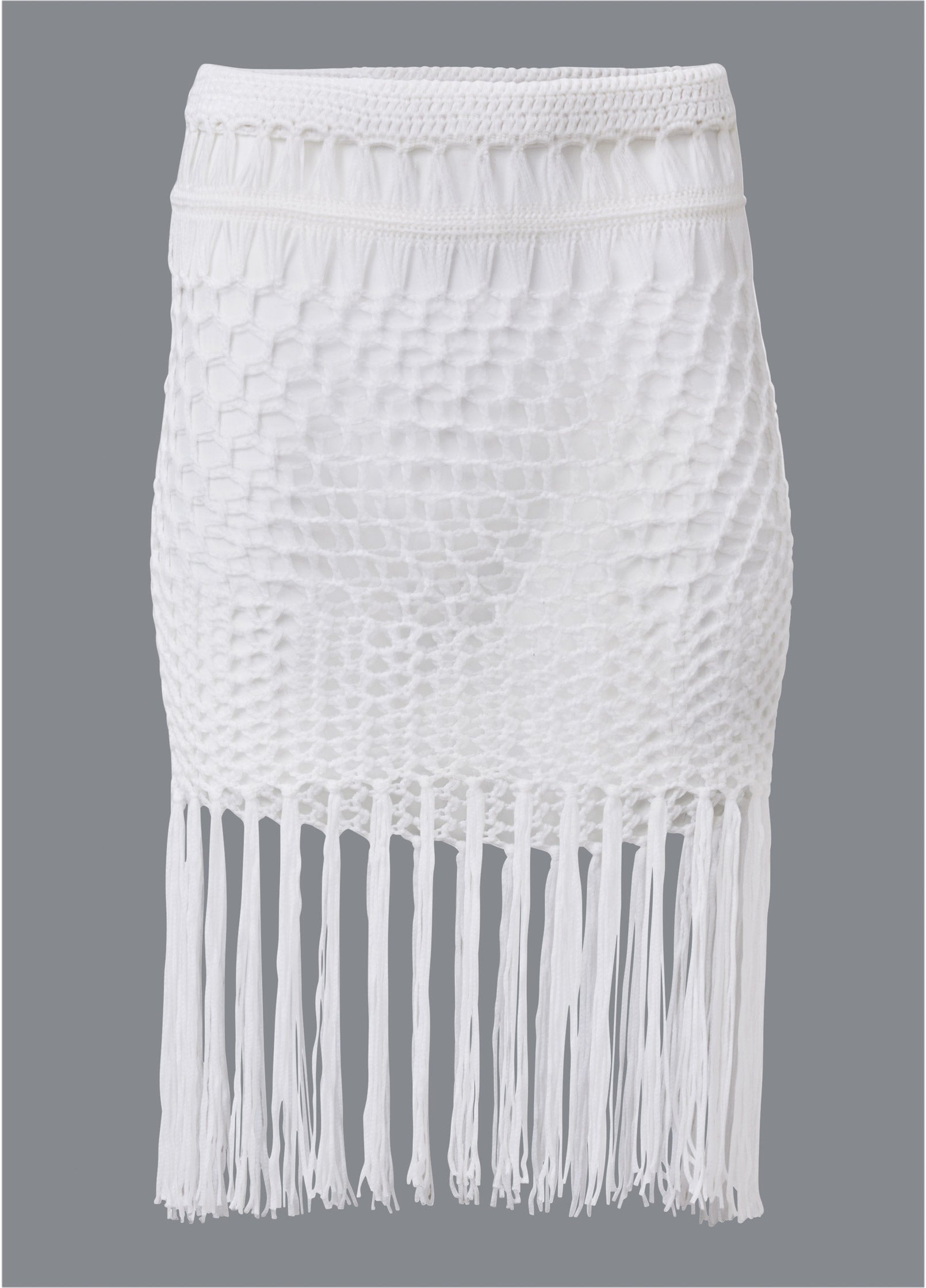 Have fun with fringe when you pull on this cover-up skirt! Sheer crochet reveals a peek of the suit underneath, sitting just above the hips with long fringy details hanging from the mini-length hem. A little bit boho, this fun skirt is an easy-pack resort getaway must!