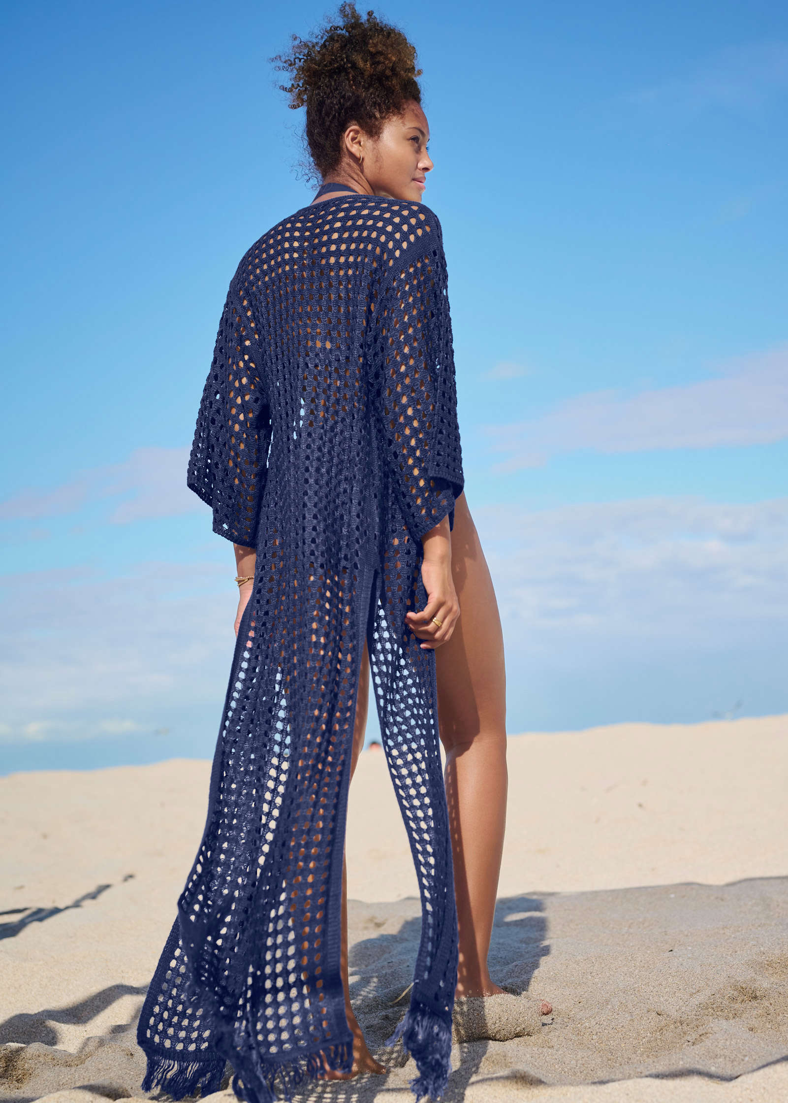 Complete your day-in-the-sun style when you toss on this crochet cover-up. The effortless kimono styling assures a loose fit, while the open crochet knit keeps it lightweight for the warmest days. Finishing with 3/4 sleeves and a fringy hem, this resort-ready cover-up has you prepped for the beach in a snap. * Sizes: S (4-6), M (8-10), L (12-14), XL (16) * Plus sizes: 1X (18-20), 2X (22-24) * Fringe trim at hem * Split hem for effortless fit * Open crochet knit creates sheer coverage * Acrylic. Imported