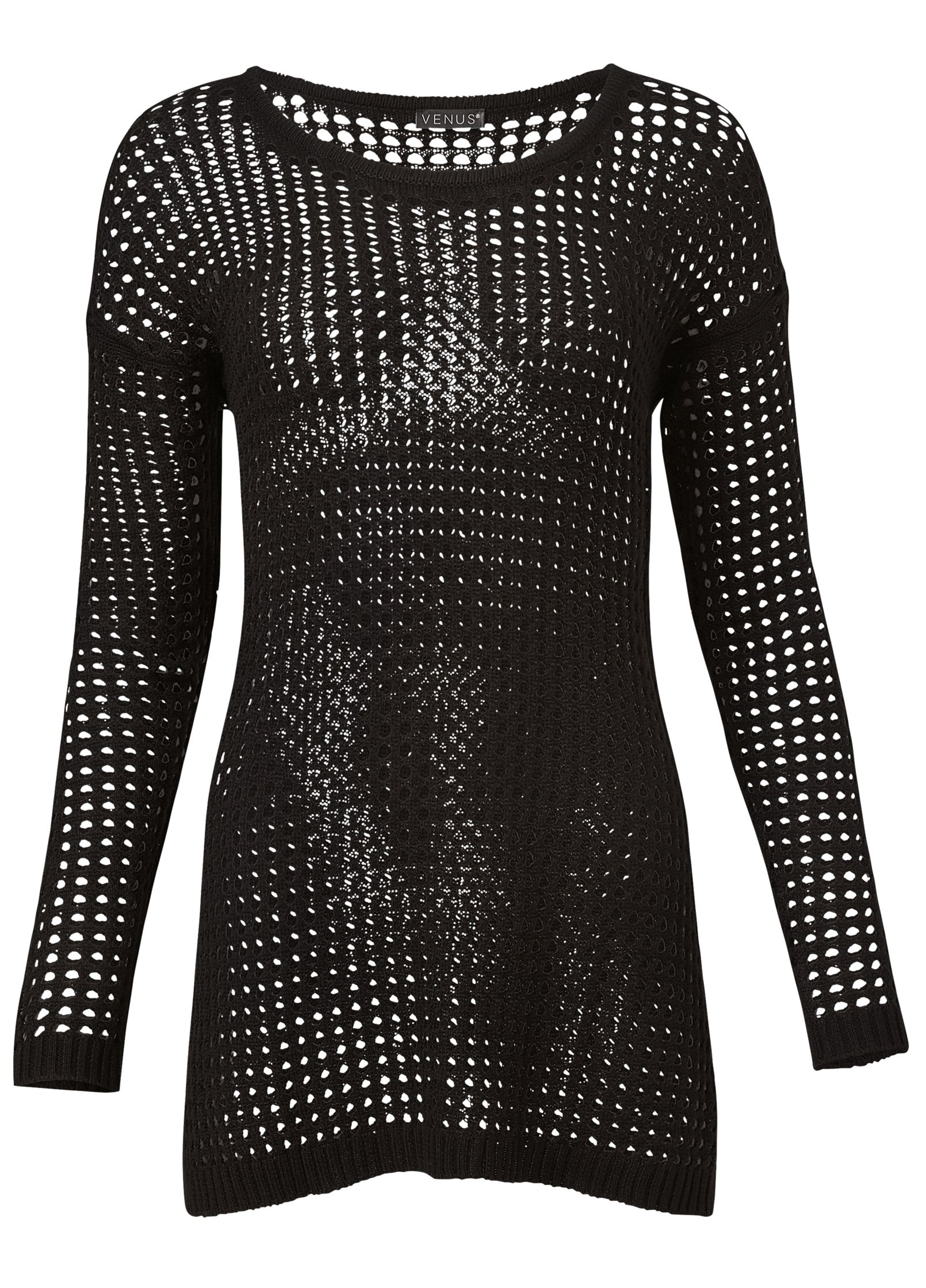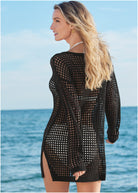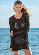 Open crochet knitting completes this long-sleeve tunic cover-up that pulls easily over any swimsuit. Sitting just below the rear, it promises ample coverage for beachside strolls with side slits and finished edges for an even easier fit.