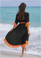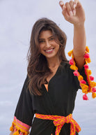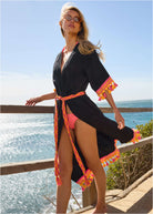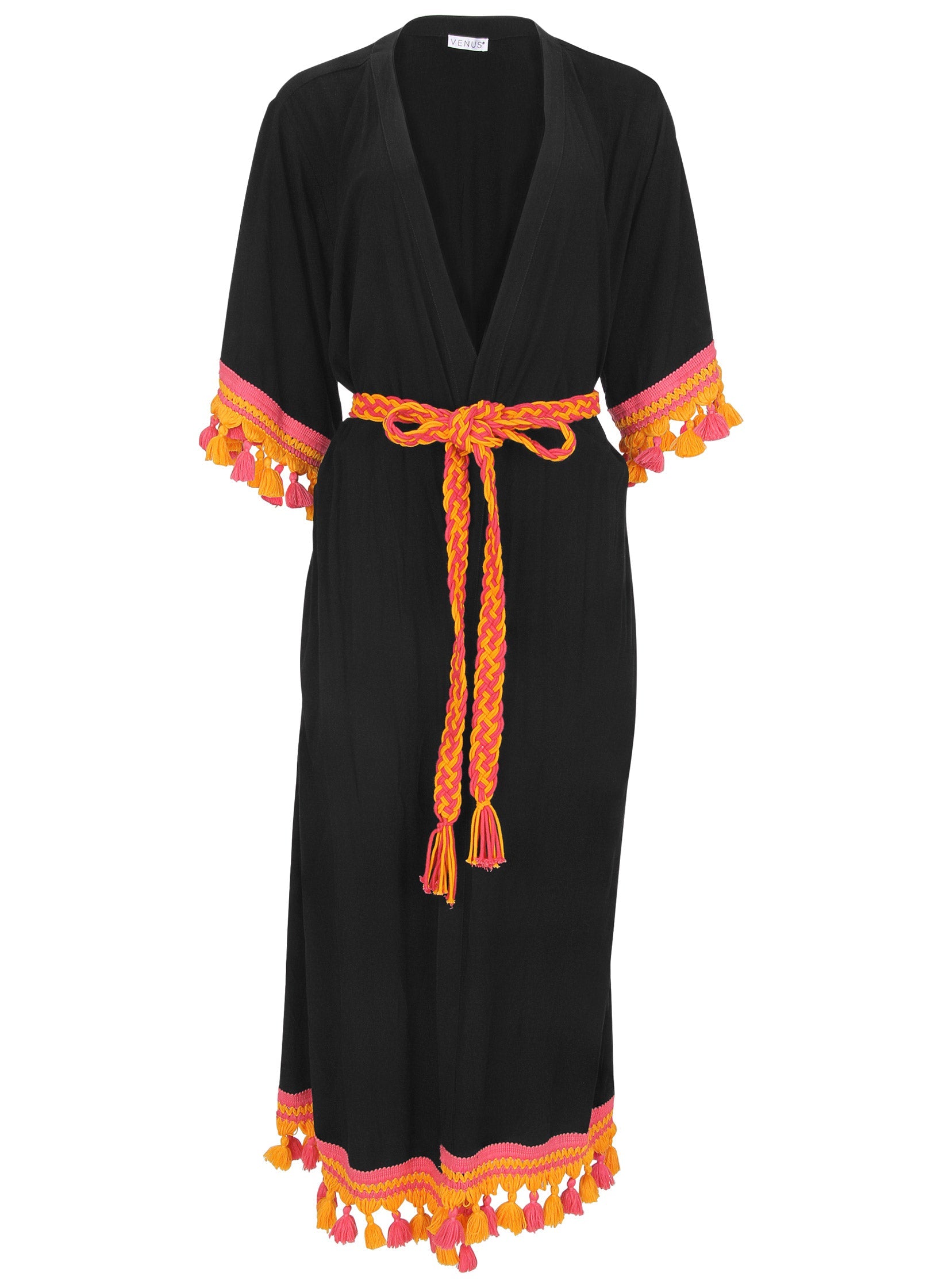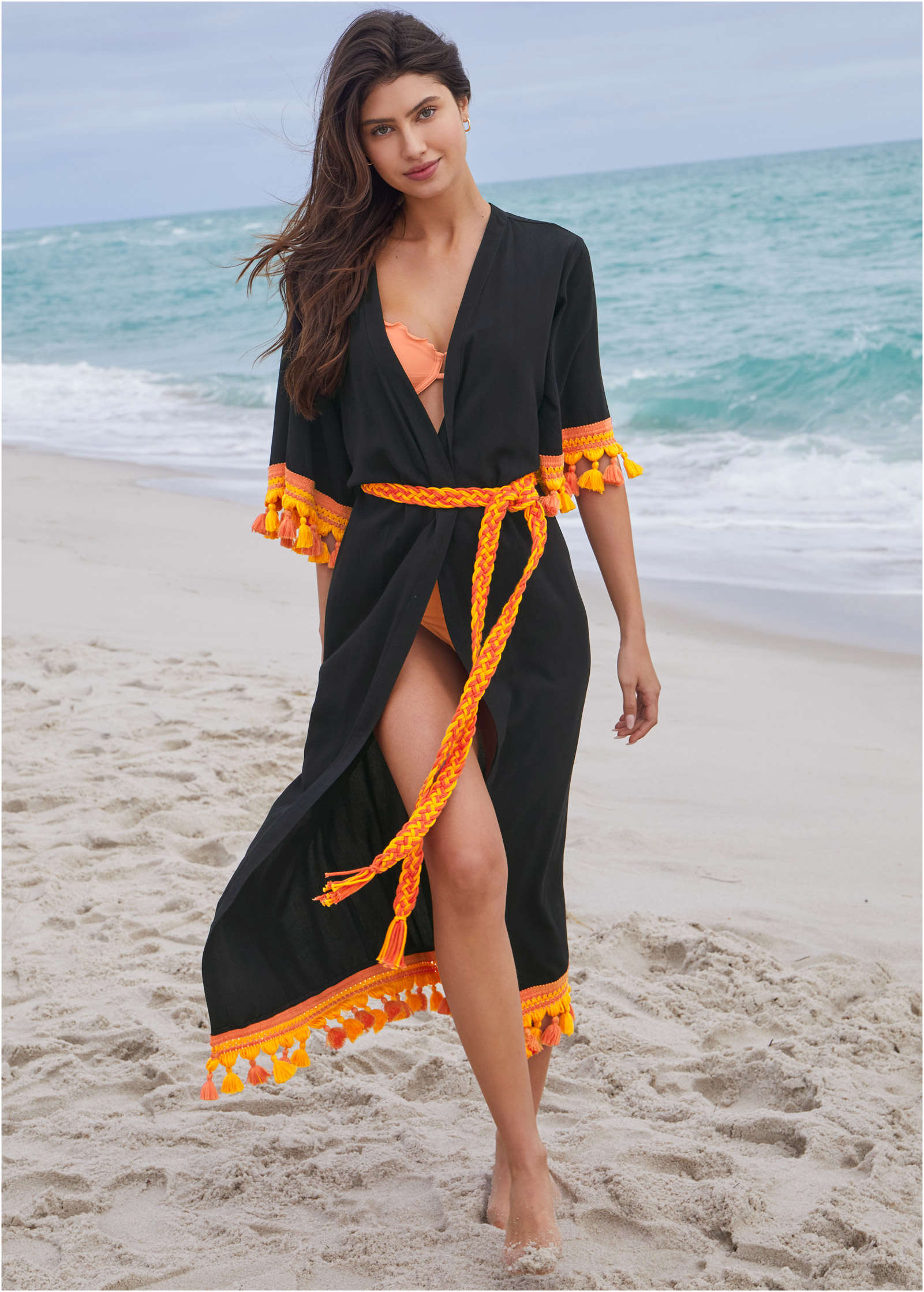 When the beach calls, you answer -- and you bring the party. This crochet kimono is made for fun getaways, thanks to colorful crochet detail and festive tassels along the sleeves and hem. The sash tie waist adds an additional pop of color, while simultaneously letting you find your perfect fit. Wear it open to show off your entire swimsuit or tie it up for a move covered-up look.