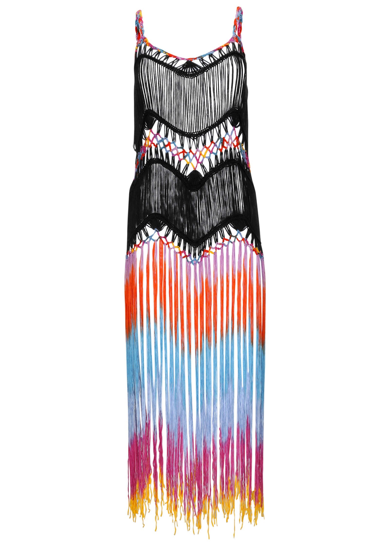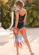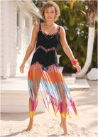 This cover-up is boho, bright and made for the sand. Featuring delicate spaghetti straps and intricate all-over crochet detailing, it’s the perfect blend of boho and beach chic. The fringe accents add a playful touch while the sheer fabric ensures your swimsuit still steals the spotlight. * Spaghetti straps: Light and breezy for easy wear in the heat. * All-over crochet: A beautiful pattern that adds texture and style. * Fringe detail: Playful and fun, giving the dress movement with every step. * Sheer: Perfect for showing off your swimsuit while staying stylish. * Acrylic. Imported