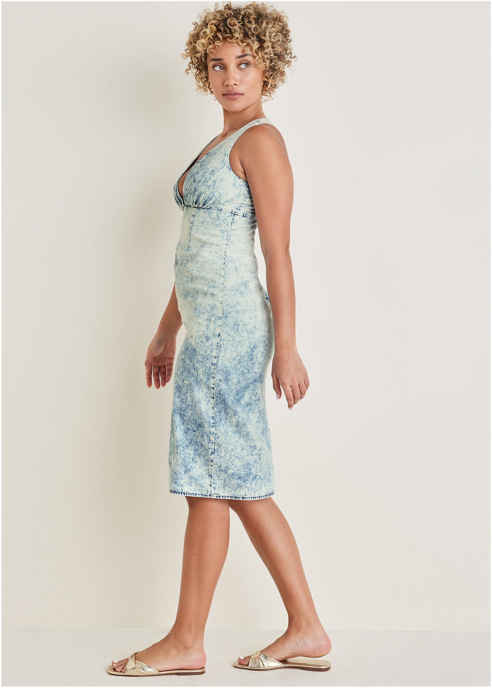 Denim definitely got the memo to take it easy this summer! This sun-bleached denim dress is laid-back and carefree with its unique acid wash that looks like it spent hours in the sun. With a bold plunging neckline and flirty front slit in the skirt, this midi dress is ready for warm days and hot nights alike.