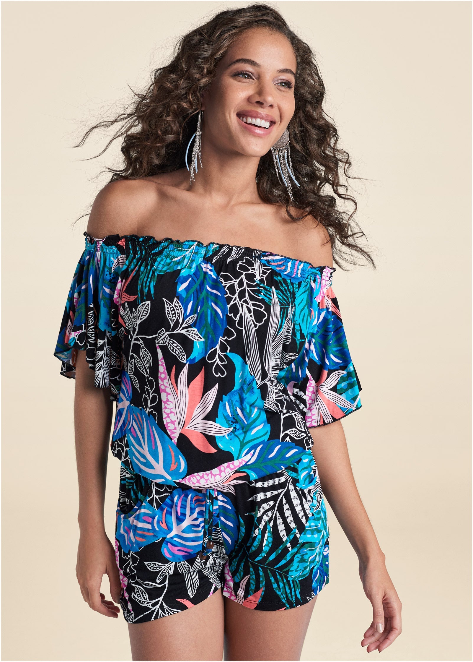 Easy floaty sleeves and loose-fit shorts lend breathability to this off-the-shoulder romper made for warmer days. Elastic cinches the waist, adding definition to the breezy top, while feminine frilled edges finish the elastic neckline. Take your pick of playful prints on this pretty one-piece.