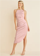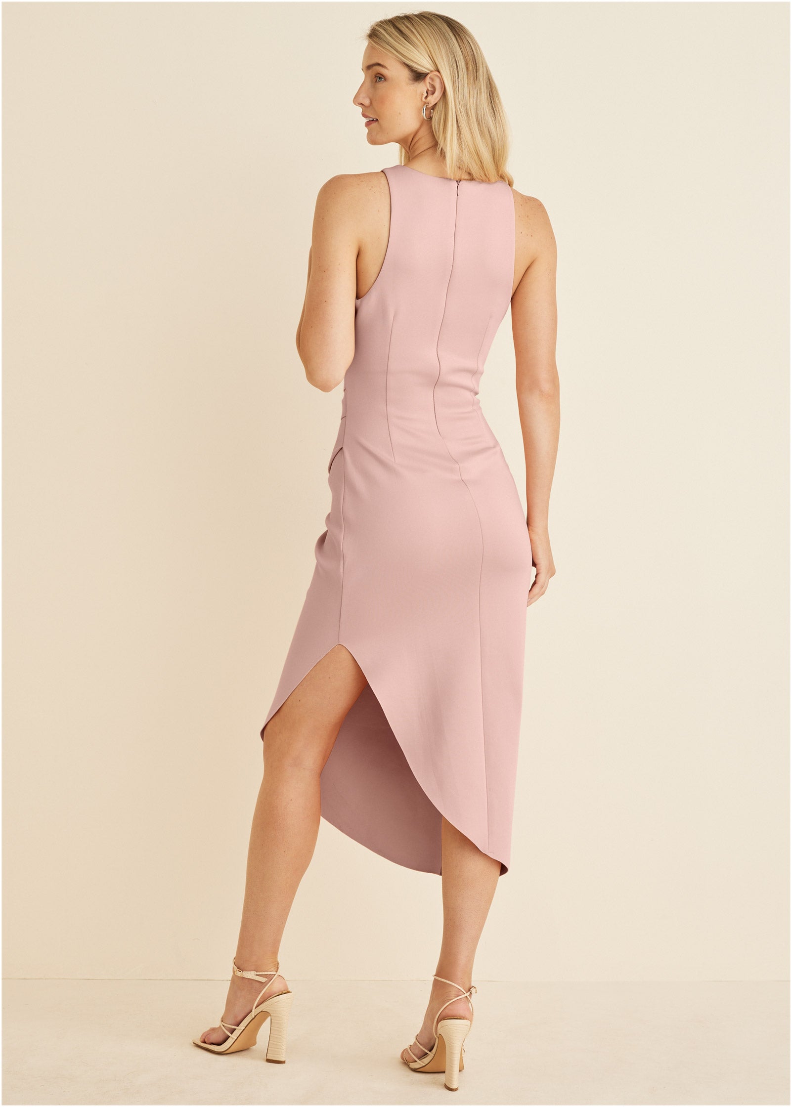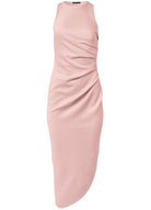 In a fit that flatters and a silhouette that draws in the eye, this Ruched Bodycon Dress promises to make you the best-dressed guest. Ruching wraps the waist before the skirt transitions into an asymmetrical hem with a slit on one side. The sleeveless neckline leaves room for your favorite accessories!
