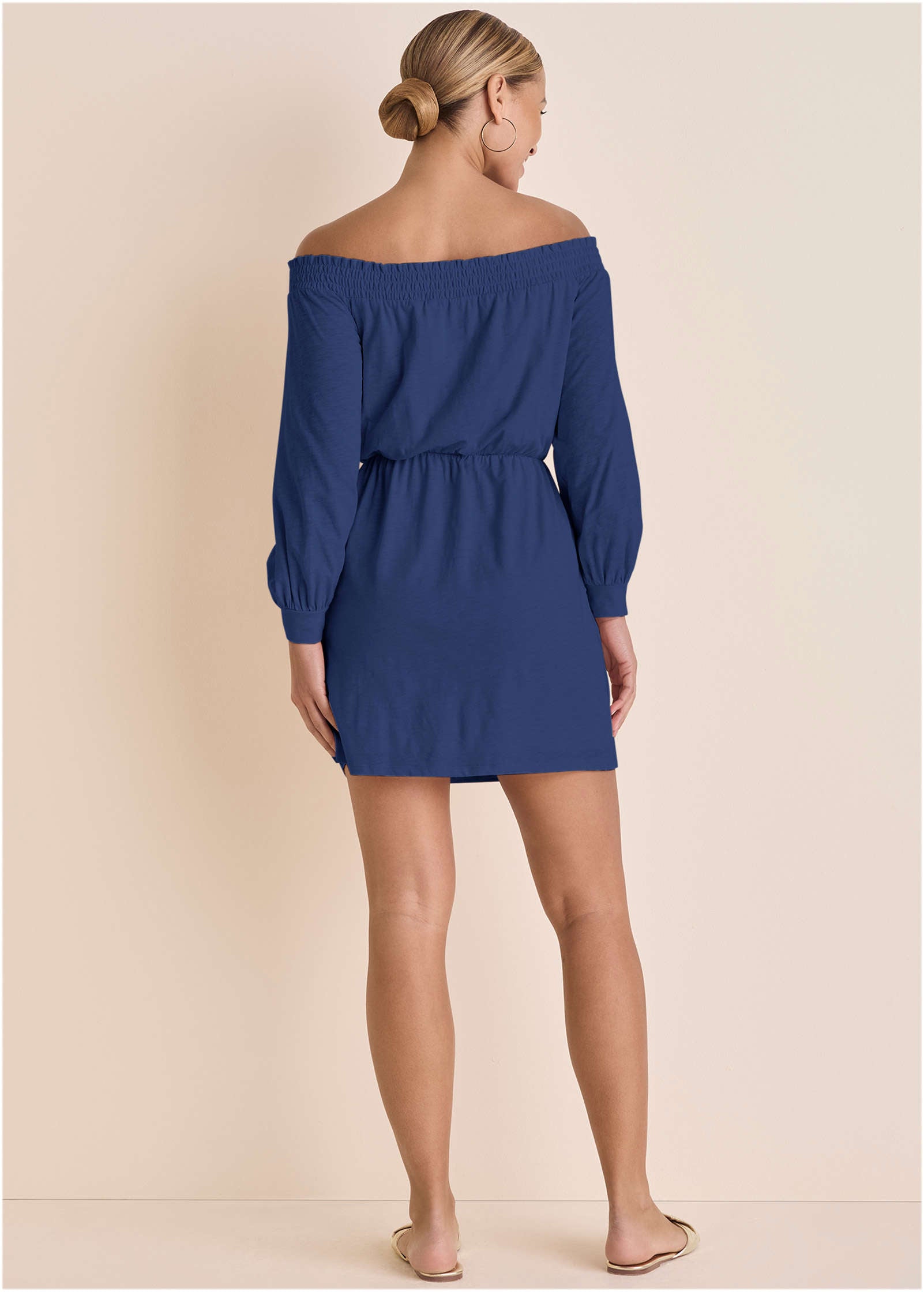 This Off-The-Shoulder Mini Dress is the definition of easy glam, featuring a shoulder-baring neckline and flowy long sleeves for that perfect balance of sexy and breezy. The elastic waistband cinches your shape while keeping things comfy, and the mini length shows just the right amount of leg.