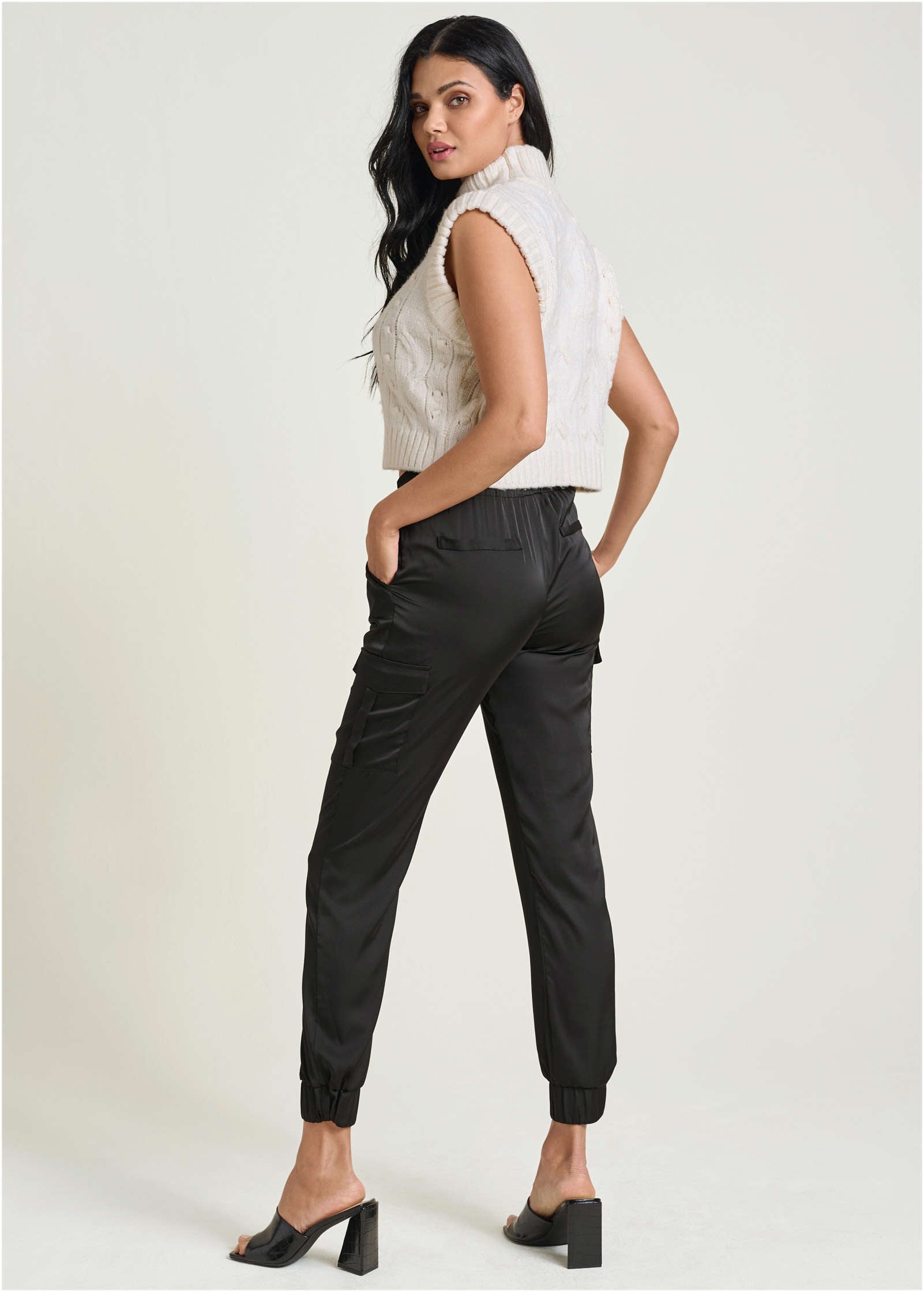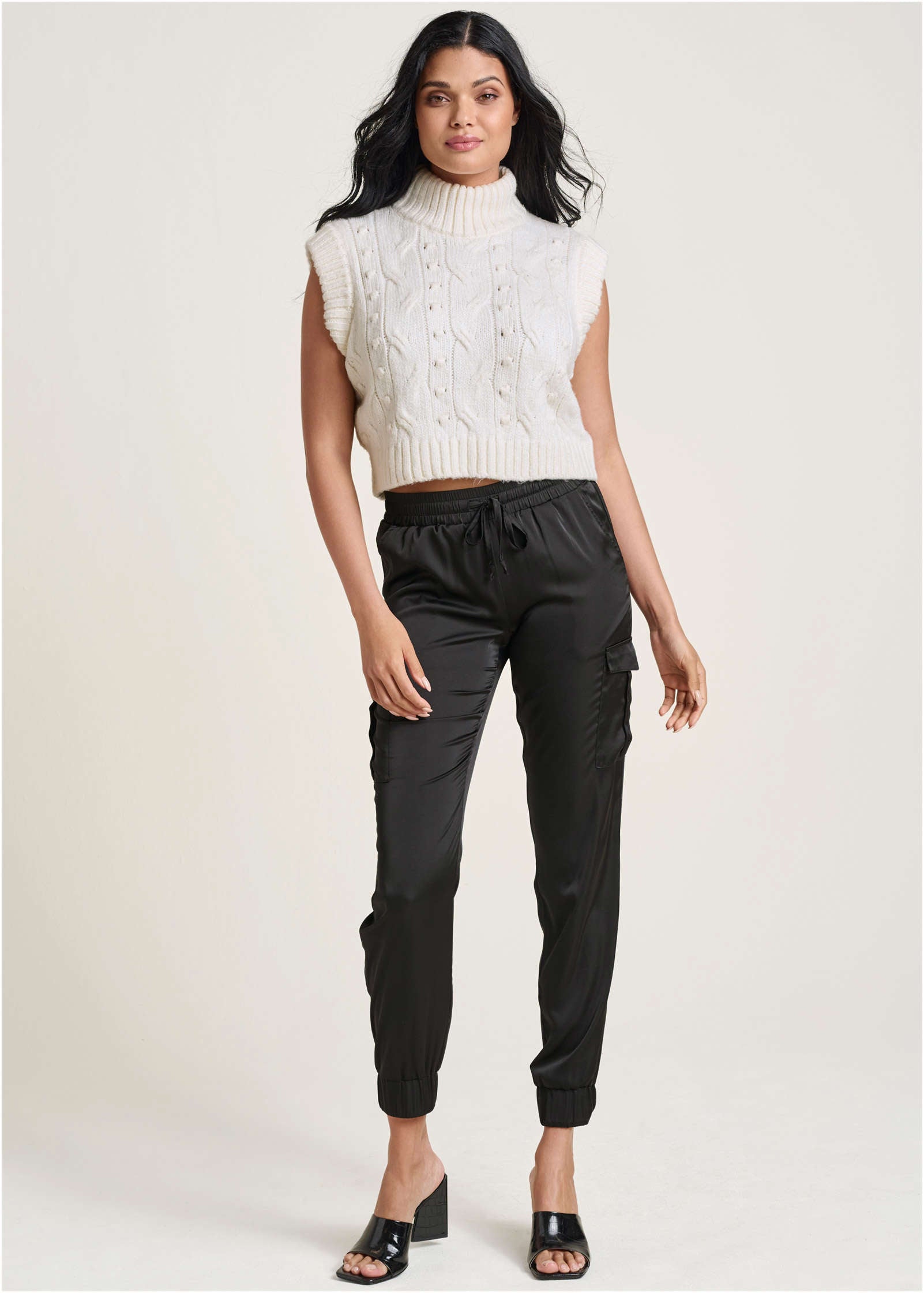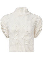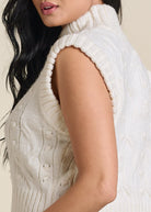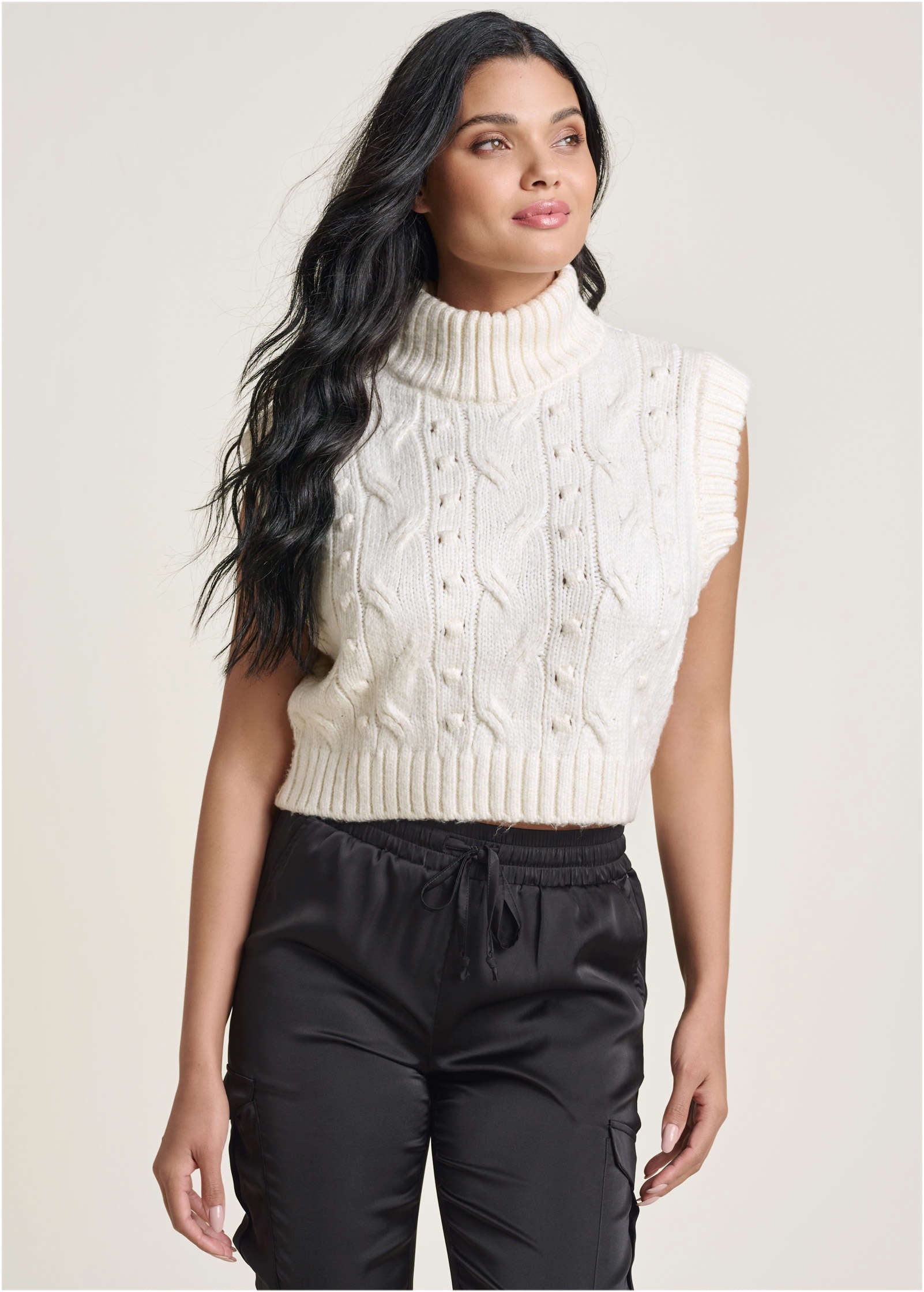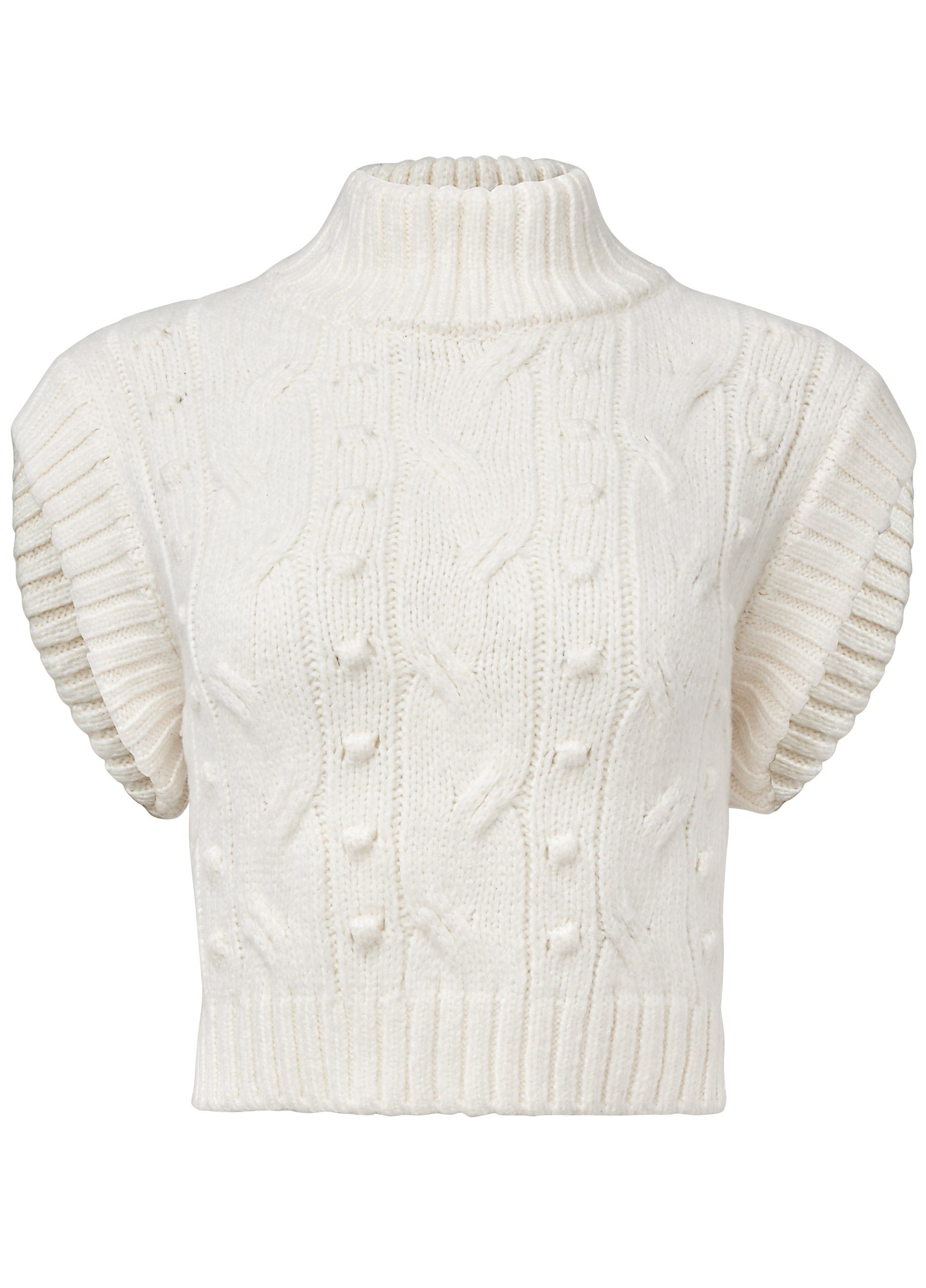 Consider this cropped sleeveless sweater a cool-weather take on your favorite tank. Classic cable knit gets a fresh update with rib-knit trim and strong shoulders that make a bold statement. Pair with high-rise bottoms in an elevated finish, like silky joggers or coated jeans for a look that goes from day into evening with ease.