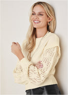 In our pointelle sleeve crewneck sweater, your outfit is always on point! The open-stitch sleeves create an airy feel that effortlessly transitions from season to season. With a ruffle drop sleeve hem, this top romanticizes every look whether you're dressing it up or down. * Sizes: XS (2), S (4-6), M (8-10), L (12-14), XL (16) * Plus sizes: 1X (18-20), 2X (22-24), 3X (26-28) * Long sleeves * Pointelle sleeves * Ruffle drop sleeve * Acrylic. Imported