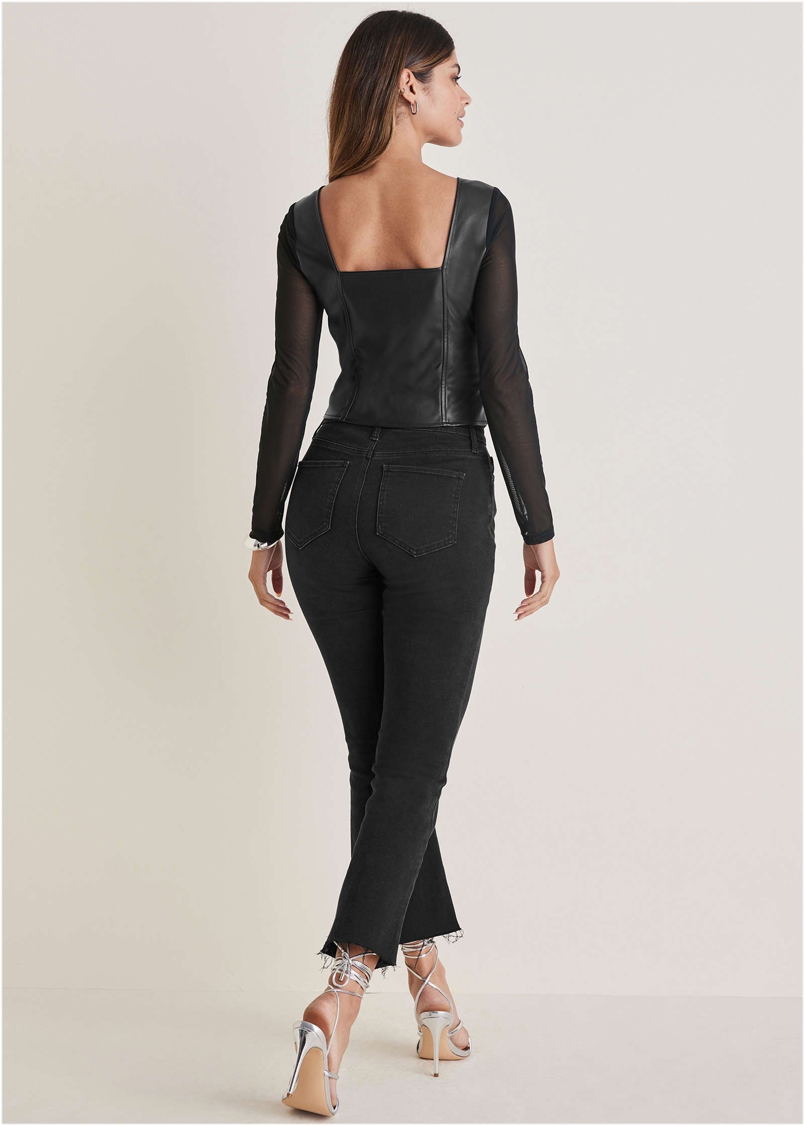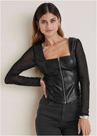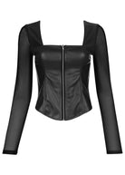 This vampy top blurs the line between fierce and femme—just like you. Done in our buttery-soft and stretchy faux leather, the corset-style bodice hugs your curves, while the sheer mesh sleeves play a flirty game of peek-a-boo. With an edgy zipper closure up the front, this look is 100% spicy. Pair with more faux leather on the bottom to really turn up the heat. * Sizes: XS (2), S (4-6), M (8-10), L (12-14), XL (16) * Square neckline * Square back * Long sleeves * Zipper front closure * Polyurethane/polyester/spandex. Imported