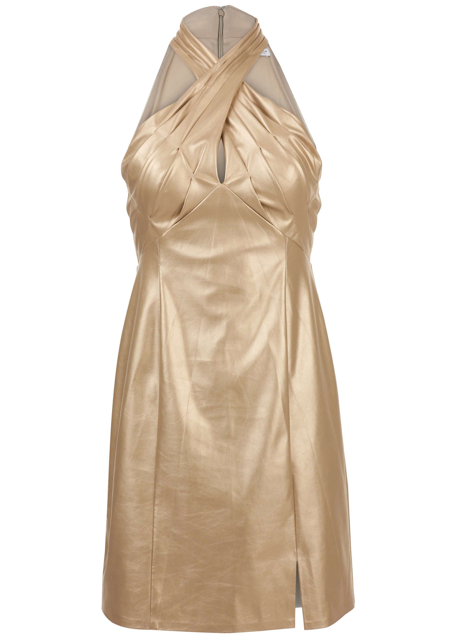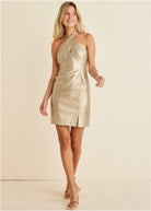 You'll be looking good as gold in this metallic mini dress. Buttery-soft and stretchy faux leather is looks so luxe and hugs every curve. The statement cross-neckline is the star of the show, but every inch of this mini shines. * Available in petite sizes * Sleeveless * Metallic finish * Mini length: 36" missy * Invisible back zipper * Viscose. Imported