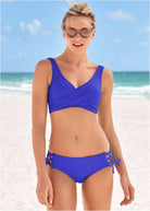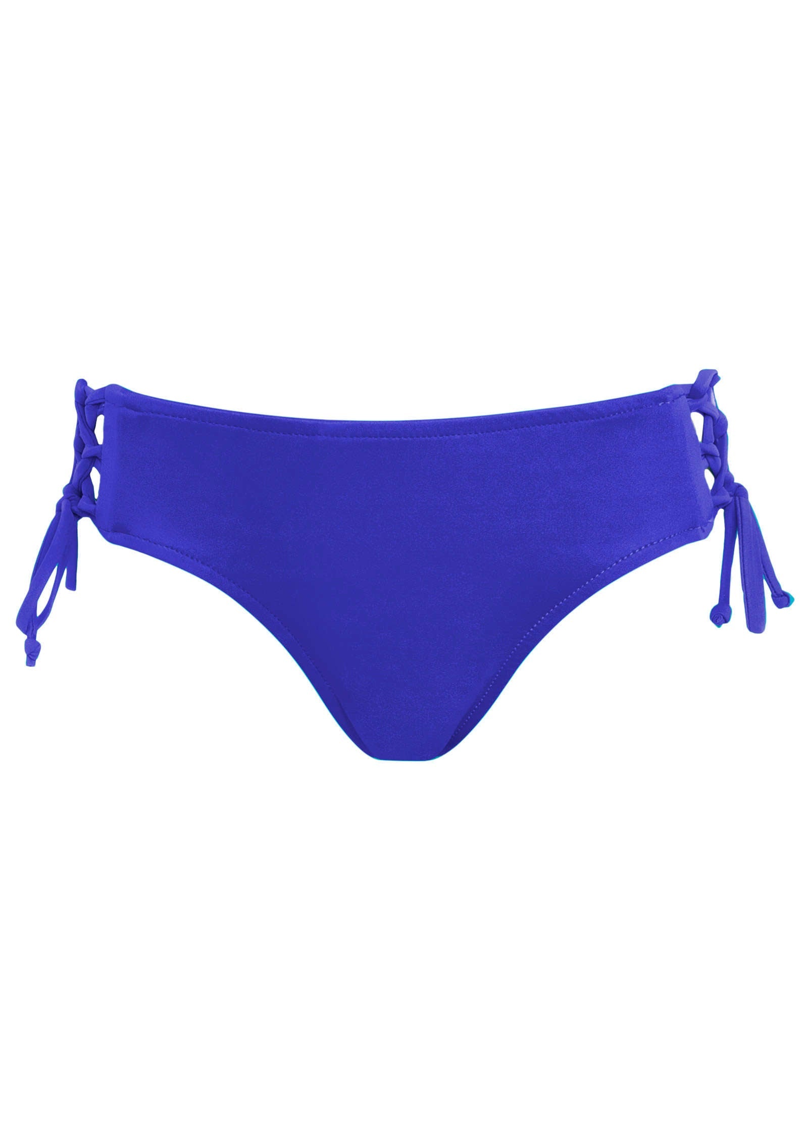 Lattice detailing at hips with adjustable ties for perfectly fitting, full rear coverage bikini bottoms.