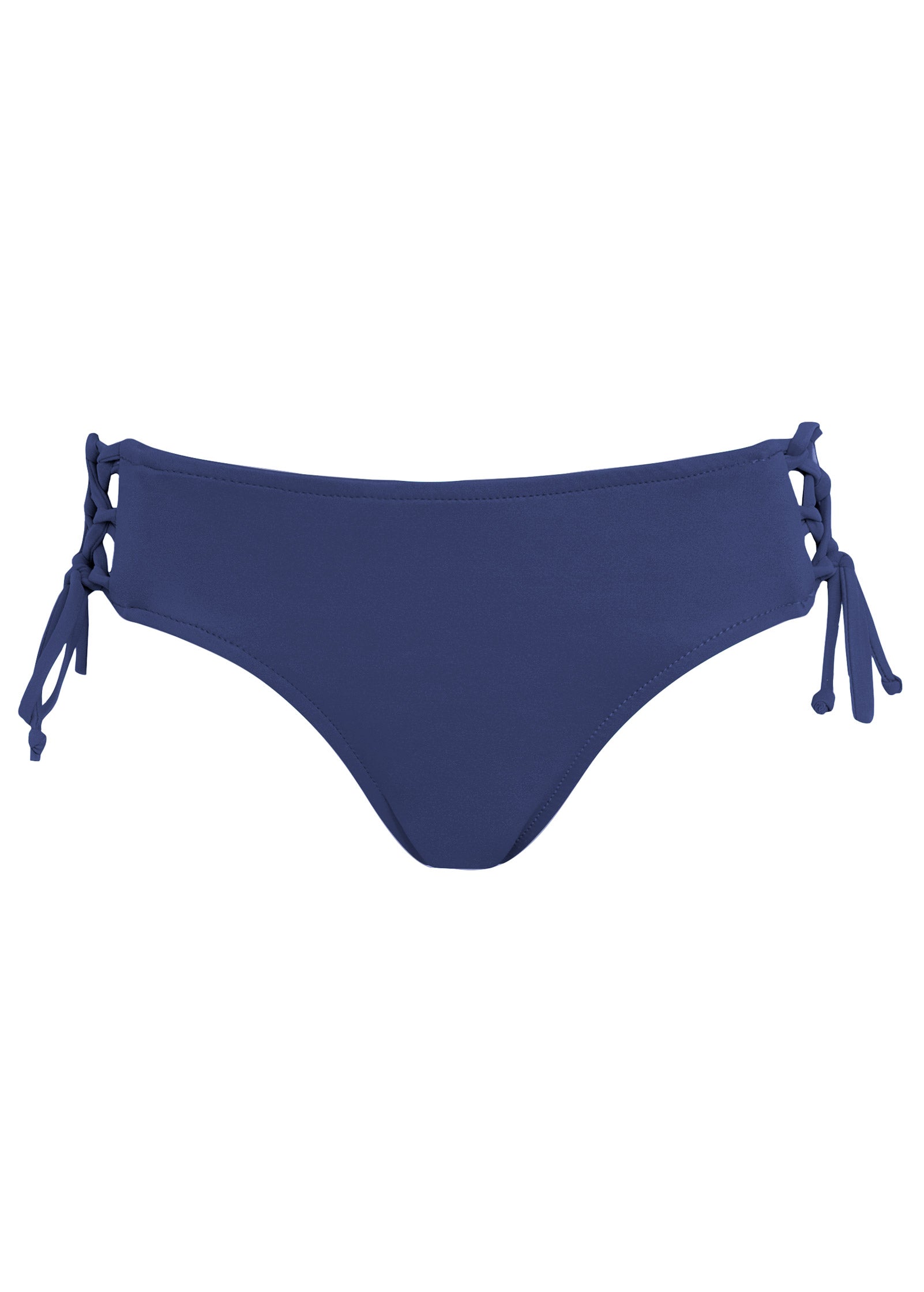 Lattice detailing at hips with adjustable ties for perfectly fitting, full rear coverage bikini bottoms.