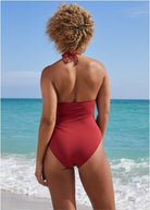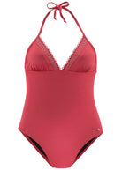 Turn heads on the beach in this chic one-piece. Laser-cut details trim the neckline, adding a subtle yet eye-catching twist to the classic swim silhouette. With halter string ties at the neck and moderate coverage in back, you'll reach for this timeless suit for swim seasons to come. * By Lascana for VENUS * Polyamide/elastane. Imported