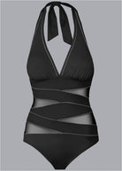 Peek-a-boo perfection! Mesh and fabric panels crisscross the bodice of this suit to flatter your curves. Contrasting piping creates contrast and adds standout detail. * Available in plus sizes * Halter tie closure * Foam shaping cups * Contrasting piping detail * Full coverage * Domestic or import of nylon/spandex tricot