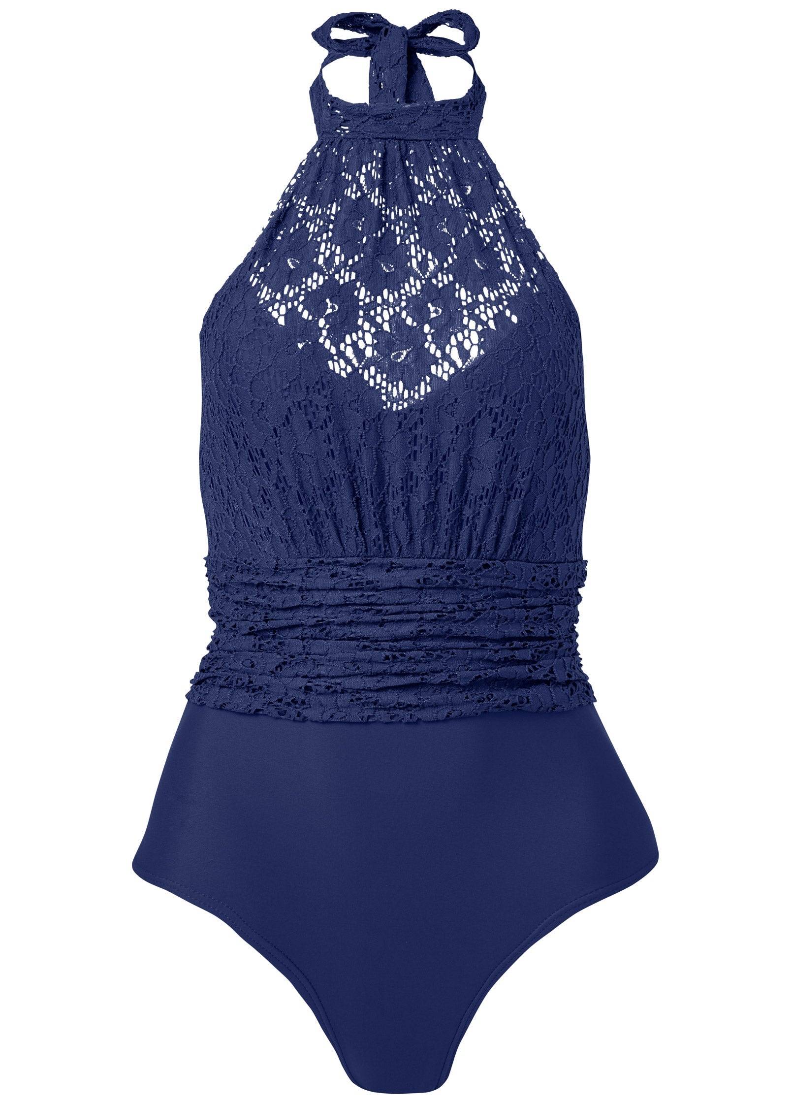 Your next romantic getaway calls for a sexy swim piece like this lacy little number. Worn for a day in the sun or for a night in the bedroom, this sultry one-piece features a high lace neck that ties in a halter. A matching sash tie secures the gathered waistband for a versatile and flirty must-have. * Available in plus size * Runs small; size up for a better fit * Floating shelf bra with removable cups * Lace overlay at upper bodice with gathered band at waist * Halter tie behind neck * Sash tie at back * Moderate rear coverage * Domestic or import of quality nylon/spandex tricot