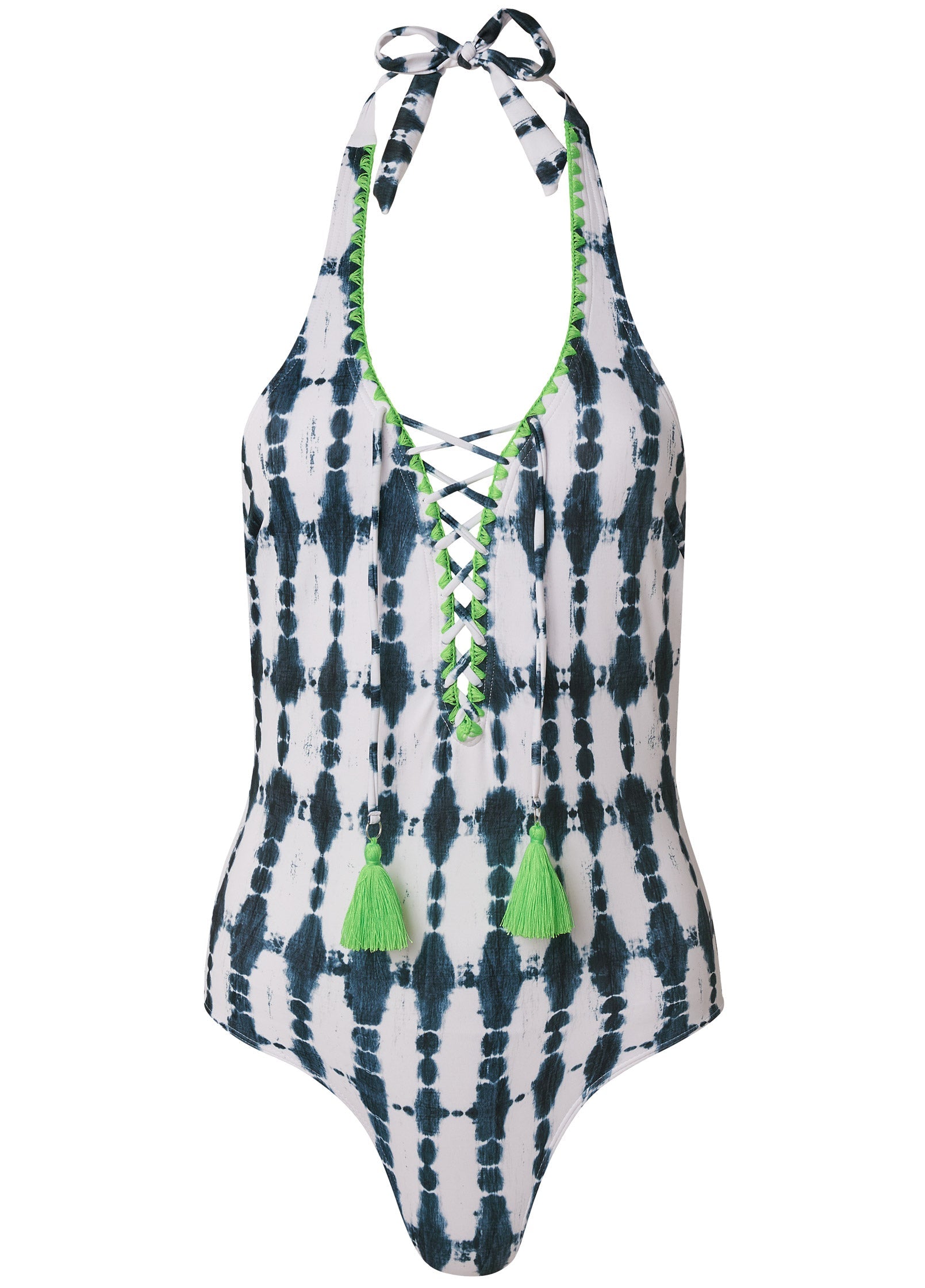 A lace-up plunge front and low open back define this alluring one-piece swimsuit, finished with bright embroidered trim and tassel accents for added bohemian flair. Choose the look and fit that's right for you with the adjustable halter neck and back ties.