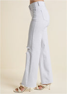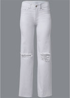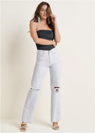 Goodbye waist gap! The elastic waistband on these high-rise jeans gives you a custom feel that lets you move with confidence all day. The 5-pocket styling is a classic denim look while of-the-moment distressing and wide legs add trendy flair. With a top tucked or untucked, you have no restrictions!