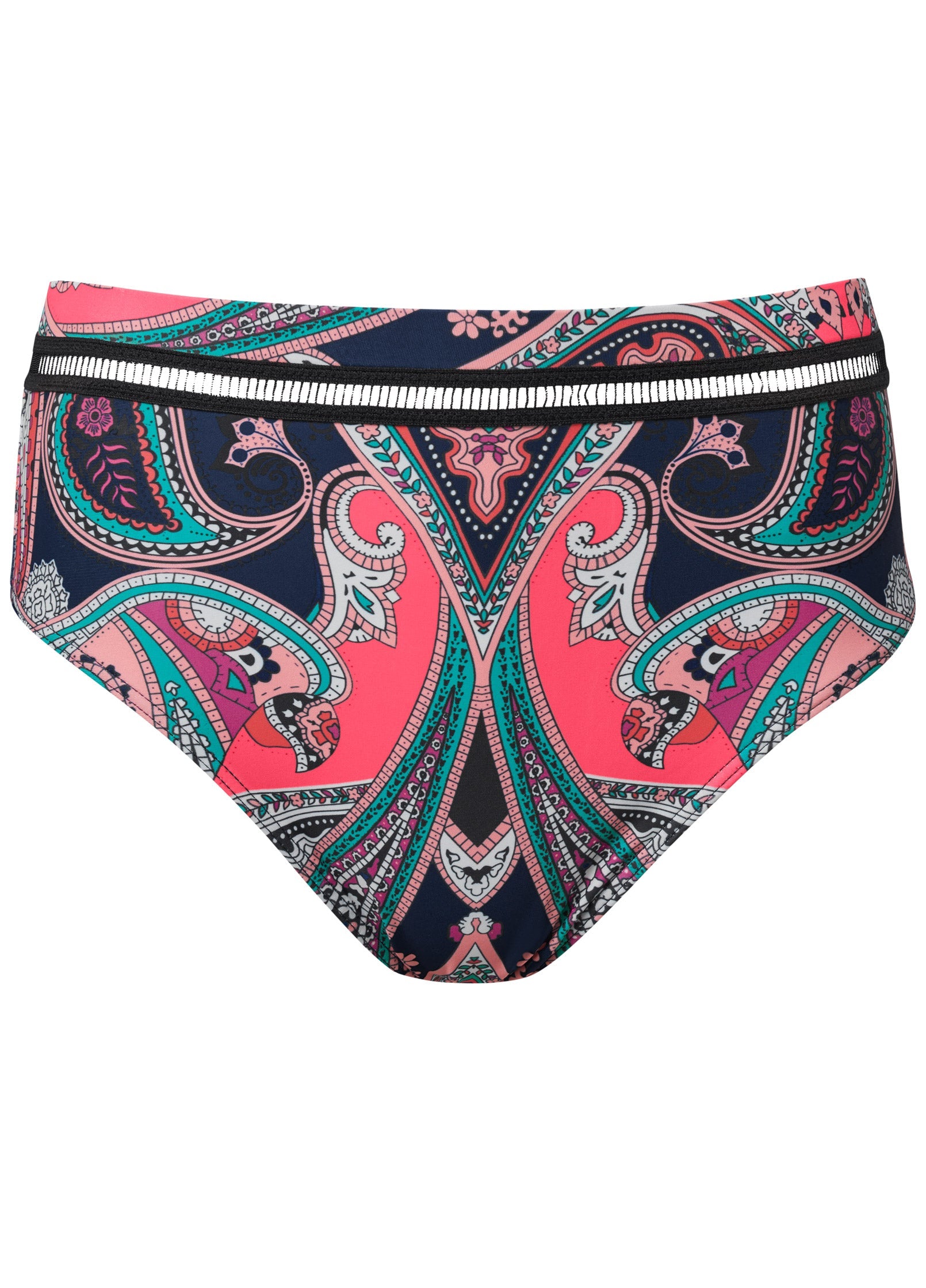 Complete with sheer trim around the waist, this high-rise brief-inspired bottom brings chic style beach-side! Moderate rear coverage is just modest enough for family vacations, though the intricate detailing reveals a touch of allure. Pair with the coordinating top for a complete day-in-the-sun look.
