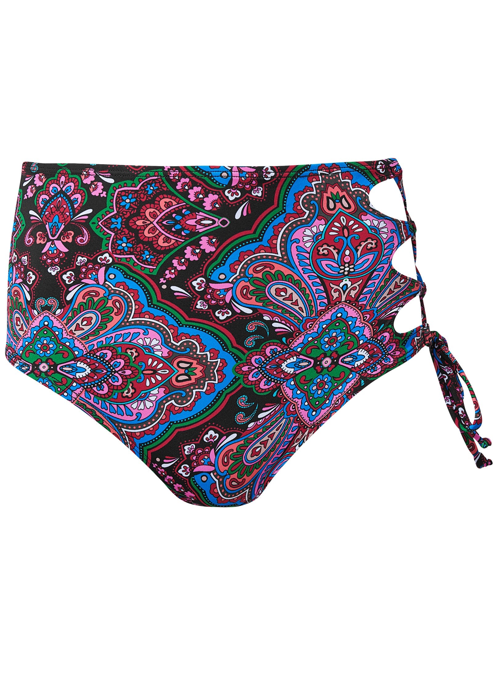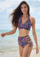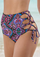 Soak up the sunshine in something bold, like this strappy high-waisted bottom! Adjustable ties lace up one side from leg opening to high hip, revealing a peek of skin underneath that makes this look unique. Moderate rear coverage contrasts the open side for the perfect balance of chic and daring.