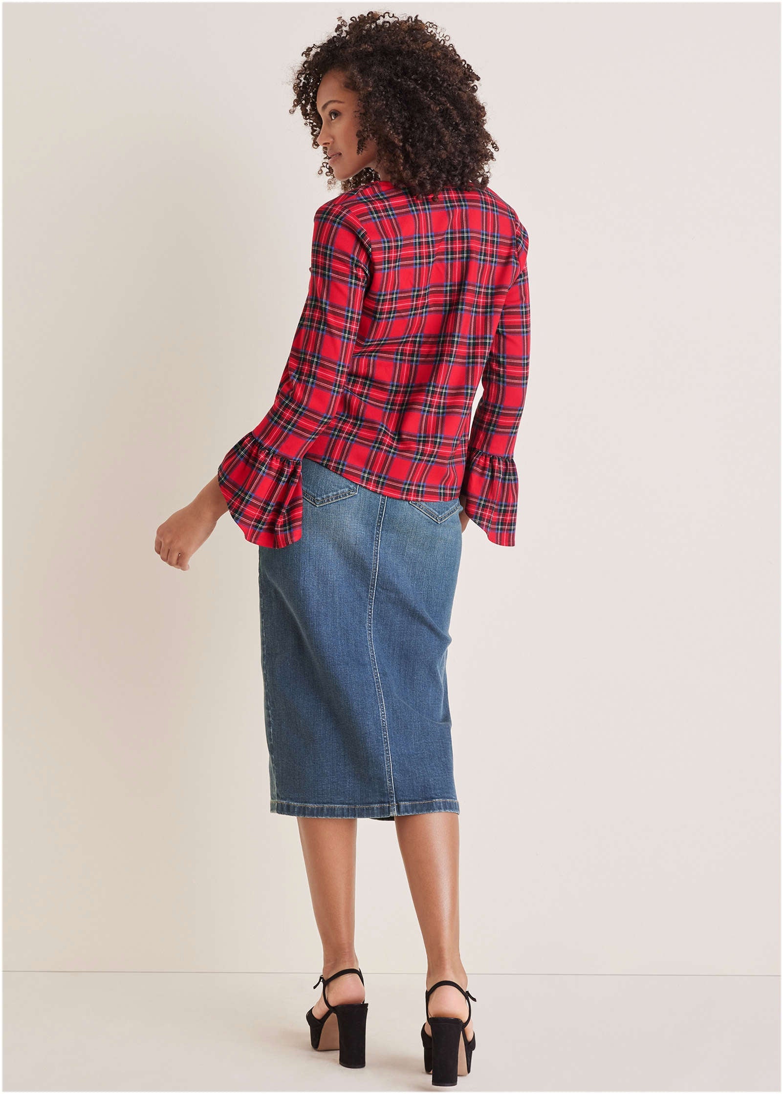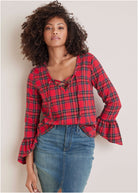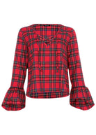 Plaid Ruffle Sleeve Top - Racing Red Multi