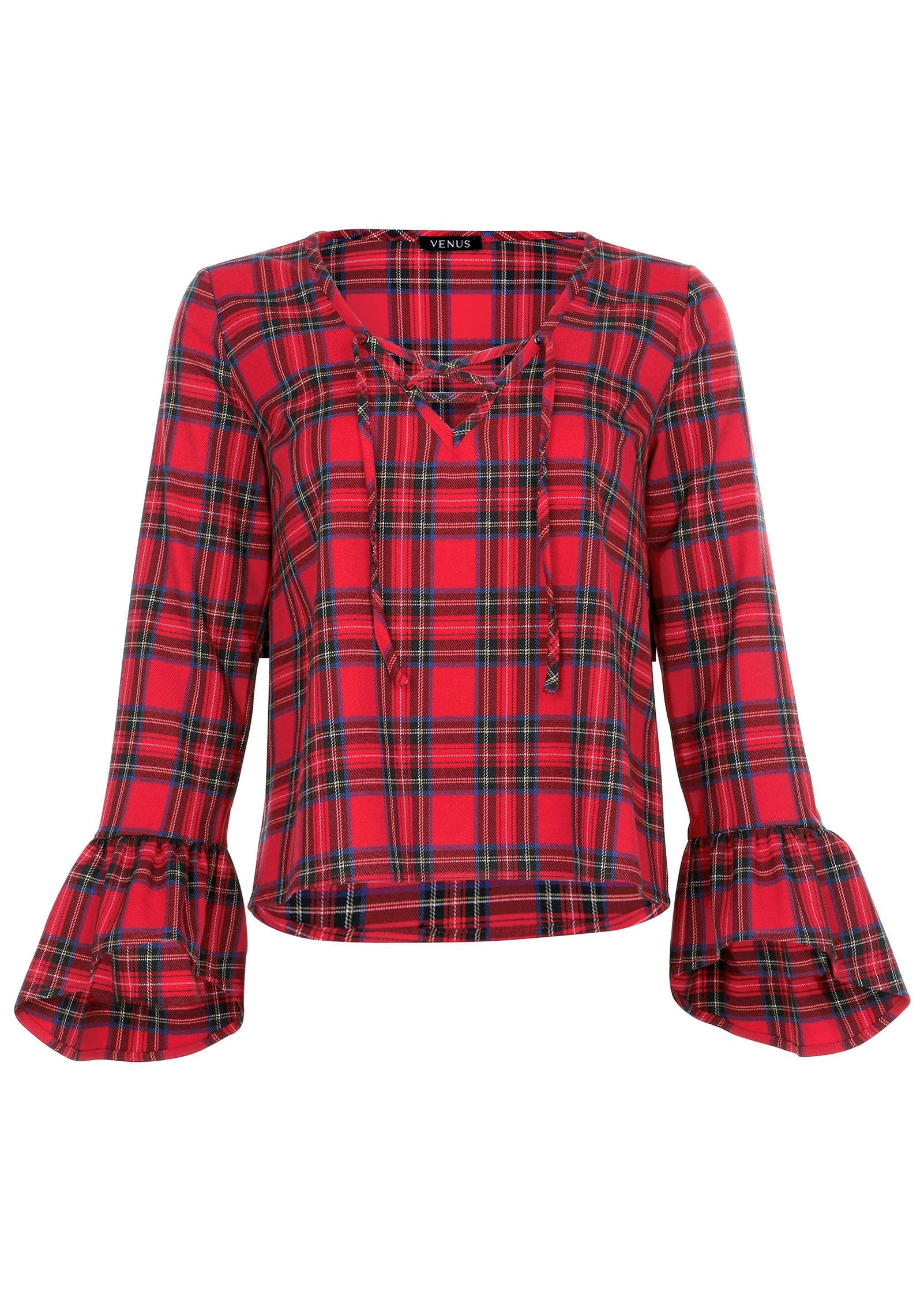 Festive plaid is a holiday season must, but this top shakes up the traditional look. A lace-up neckline and ruffles sleeves bring a trendy spin to the classic pattern, making it feel more loosened-up than ever before. Try it with a denim midi skirt and heels for holiday hosting or edge it up with faux-leather pants for an evening out.