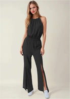 Lightweight linen meets bold, effortless style in this sleeveless halter jumpsuit. The elastic waist ensures a flattering fit, while the front slit adds a touch of sultry flair. Perfect for warm days, this easygoing piece is a must-pack for your next getaway. Whether you’re running errands, enjoying a weekend getaway, or strolling through a market, pair this jumpsuit with sneakers or sandals for an instant vacation-ready look.